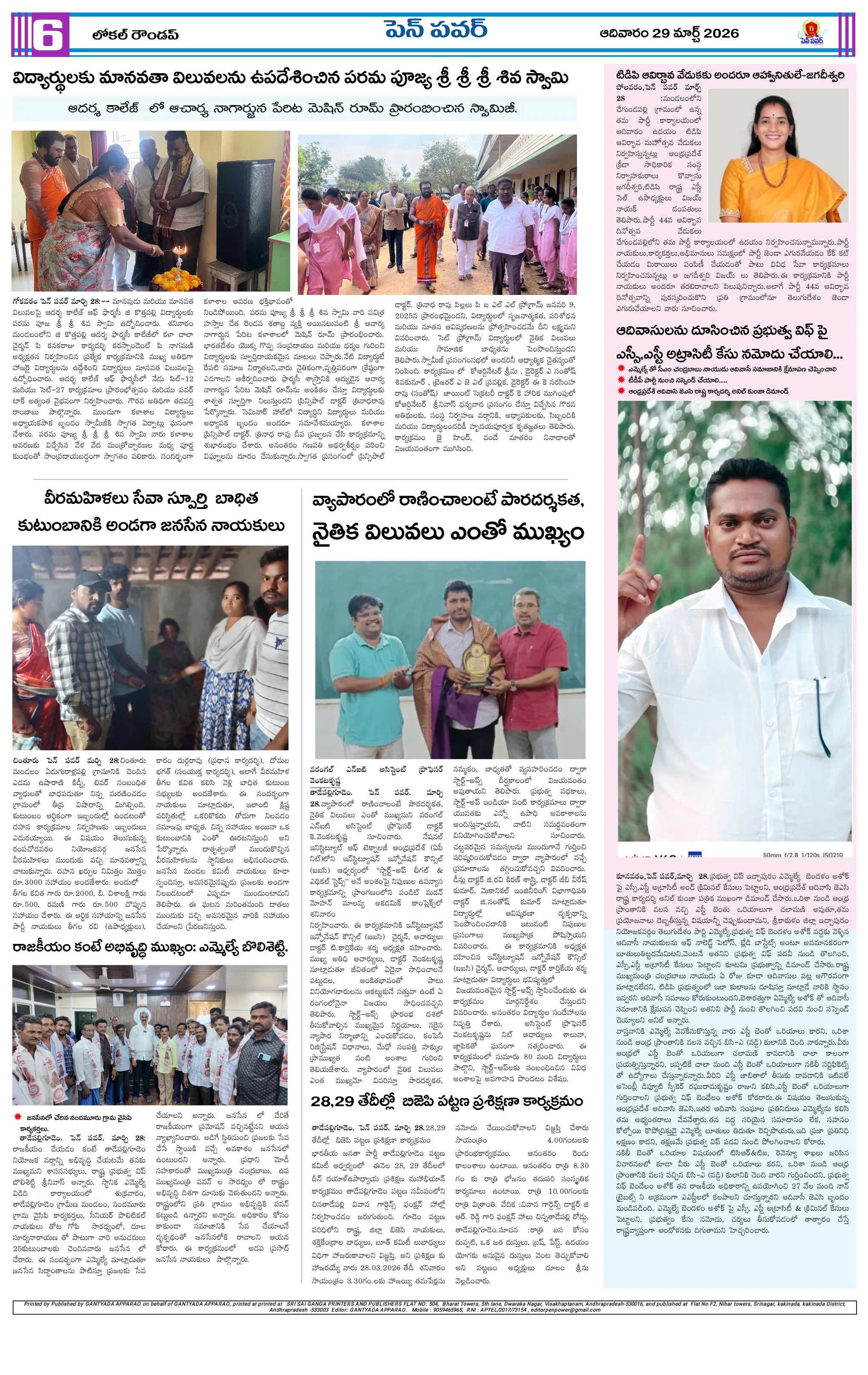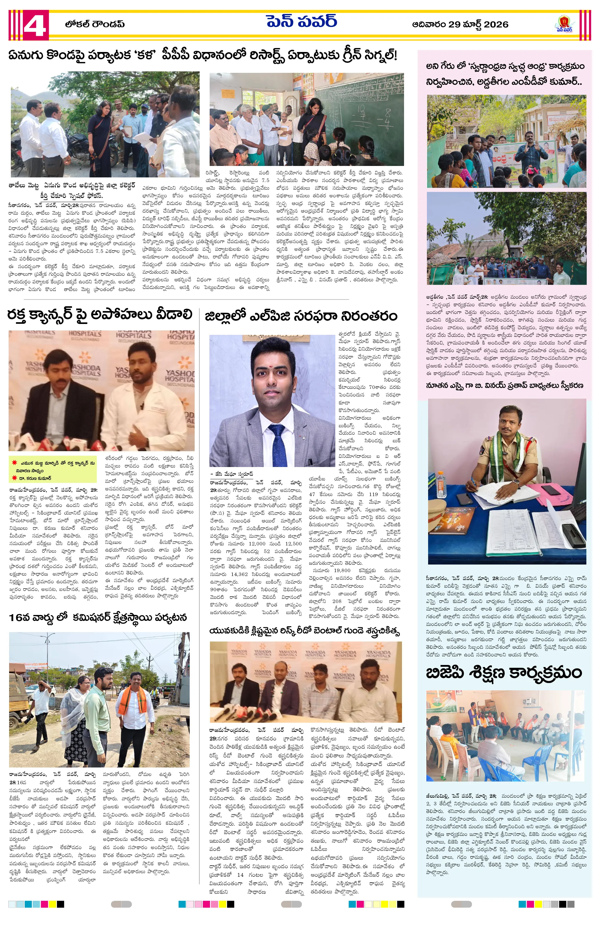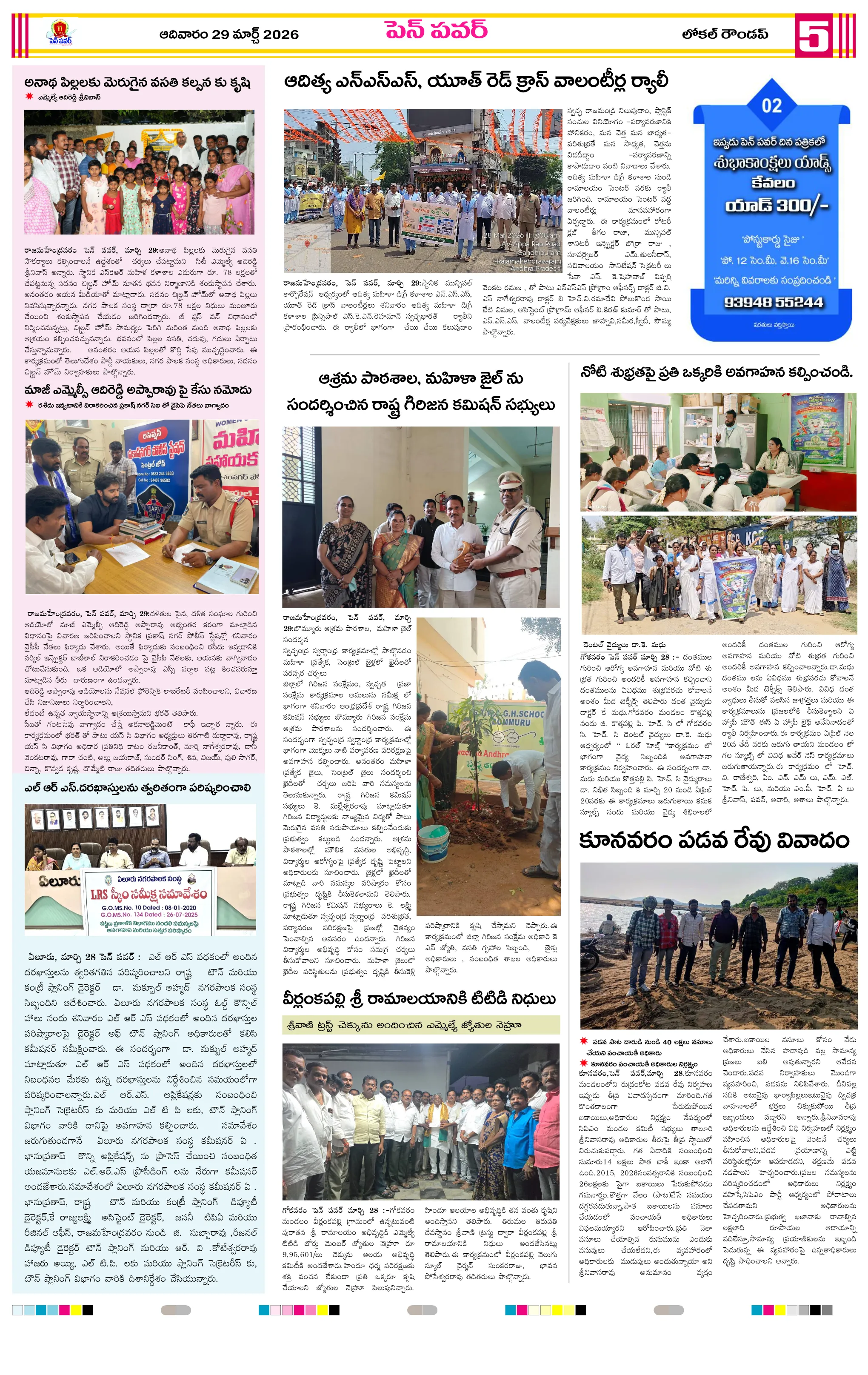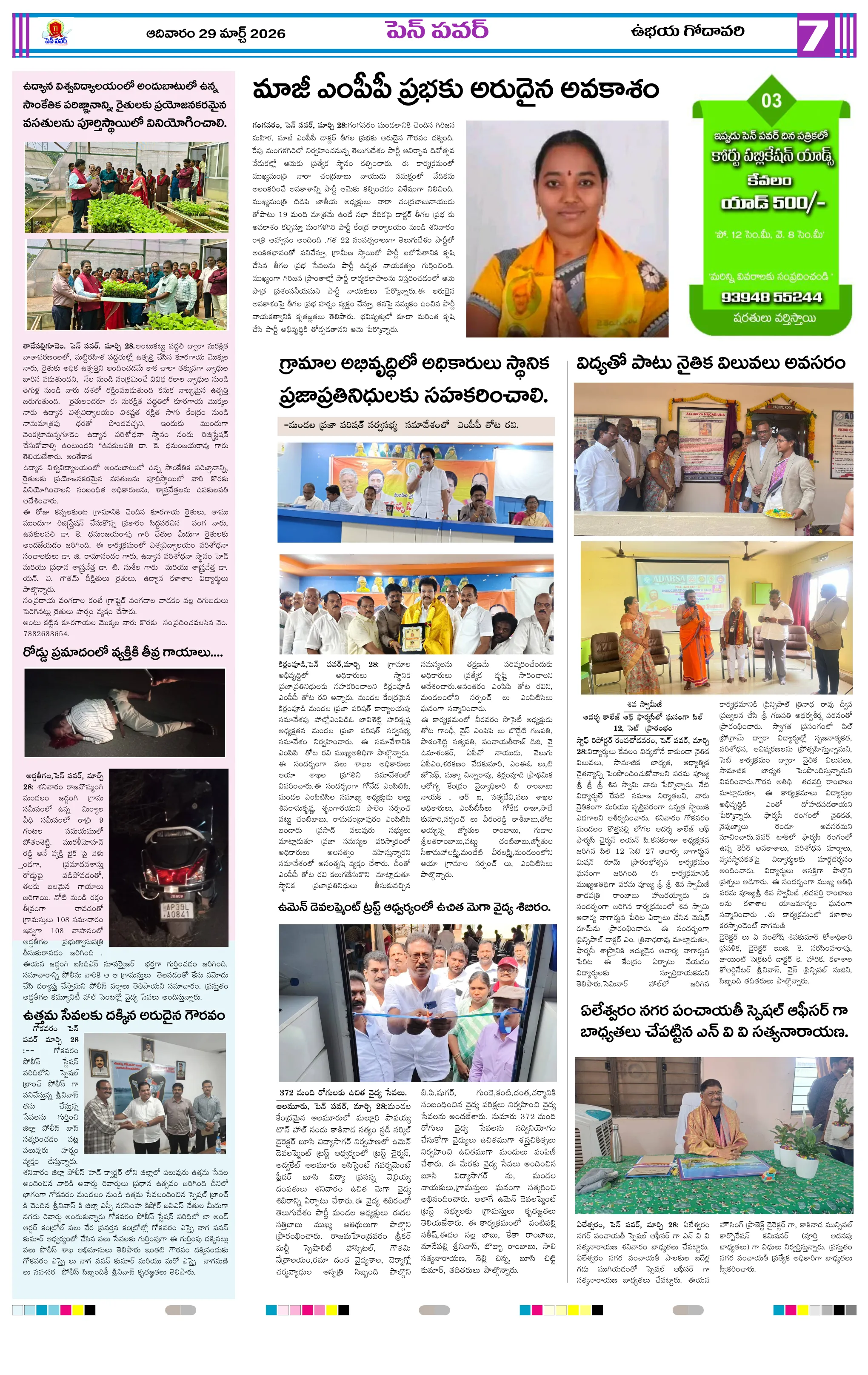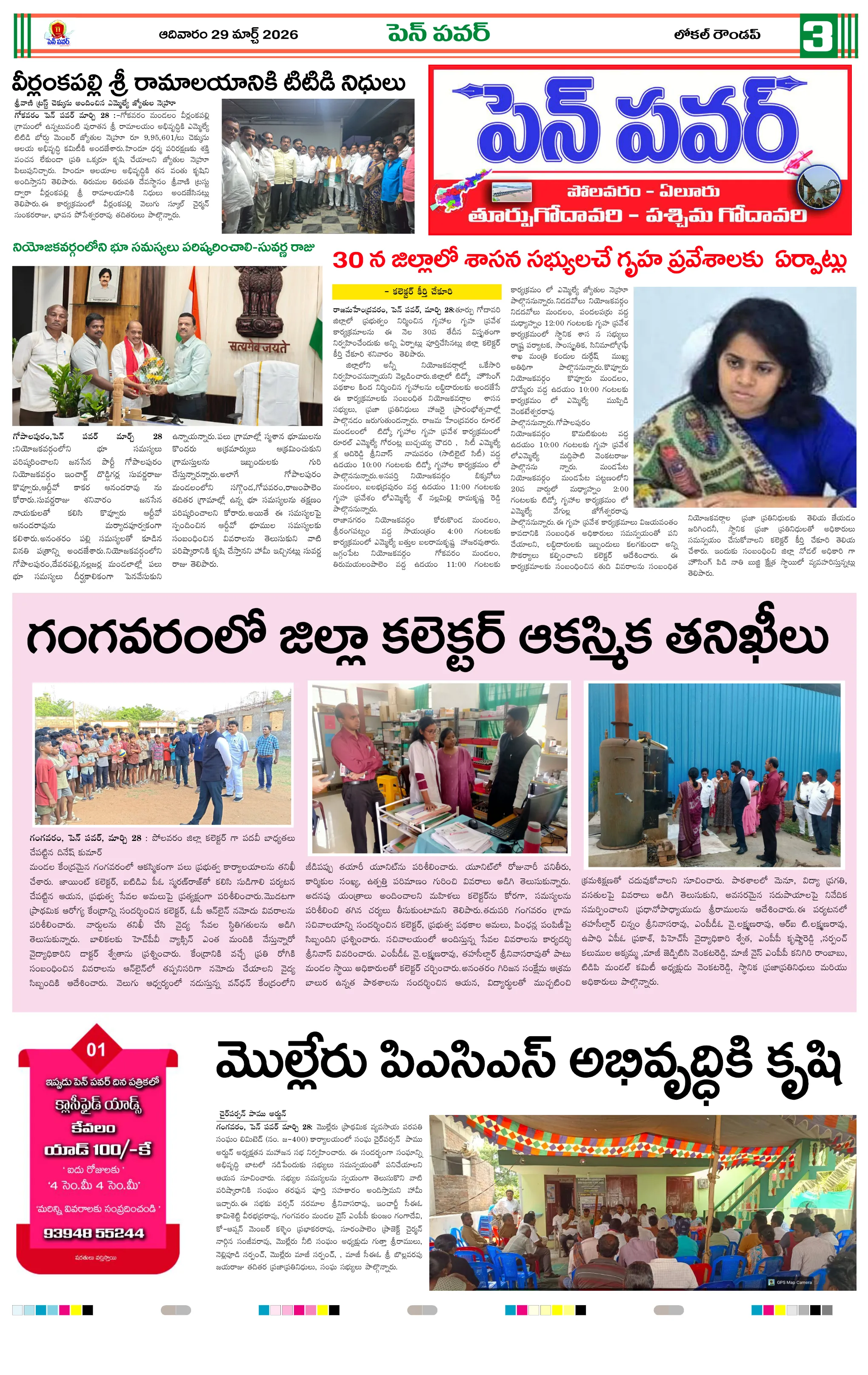 జాతీయ నేతల విగ్రహాల రక్షణకు పటిష్ట చర్యలుగ్రామాల అభివృద్ధికి ప్రత్యేక అధికారుల బాధ్యతల స్వీకారంగ్రామాల అభివృద్ధే లక్ష్యం!జగ్గంపేటలో పోలీసుల కార్డెన్ సెర్చ్మీ భూమి – మీ హక్కు కార్యక్రమంలో గిరిజన రైతులకు పట్టాల పంపిణీస్వర్ణ మొల్లేరు–జడేరు గ్రామాల్లో పర్యటించిన డిప్యూటీ ఎంపీడీవో గోపన్నదొరరెవెన్యూ సేవల్లో పారదర్శకతే ప్రభుత్వ లక్ష్యంగ్రామాభివృద్ధికి సమిష్టిగా సహకరించాలిఆరు పంచాయతీలకు ప్రత్యేక అధికారిగా అడ్డతీగల ఎంపీడీవో కుమార్..నీరులేని నీటి తొట్టెలు మూగజీవాల దాహార్తి తీరేదెలా?
