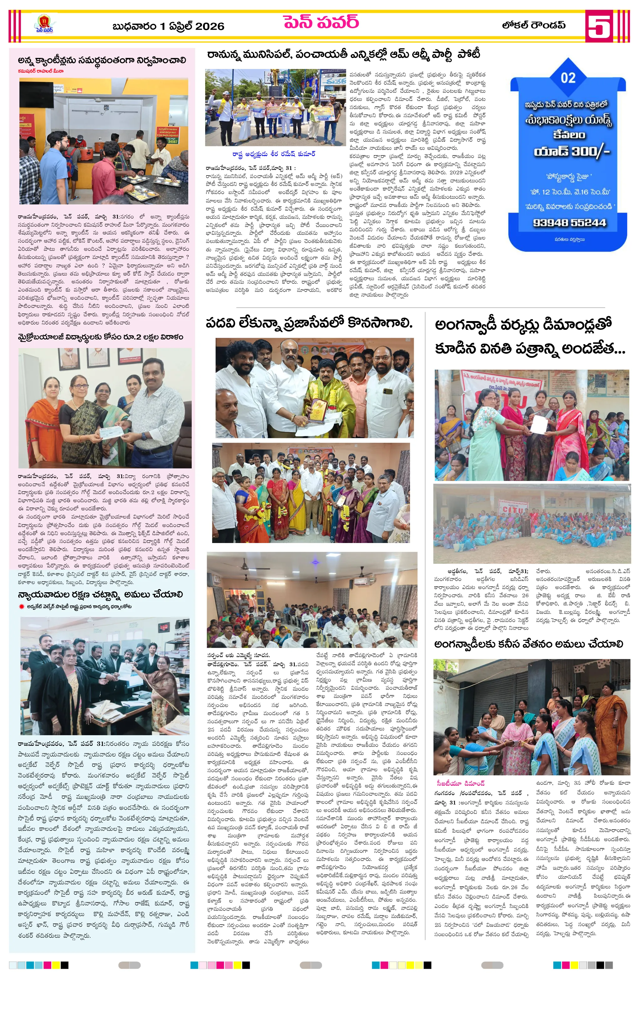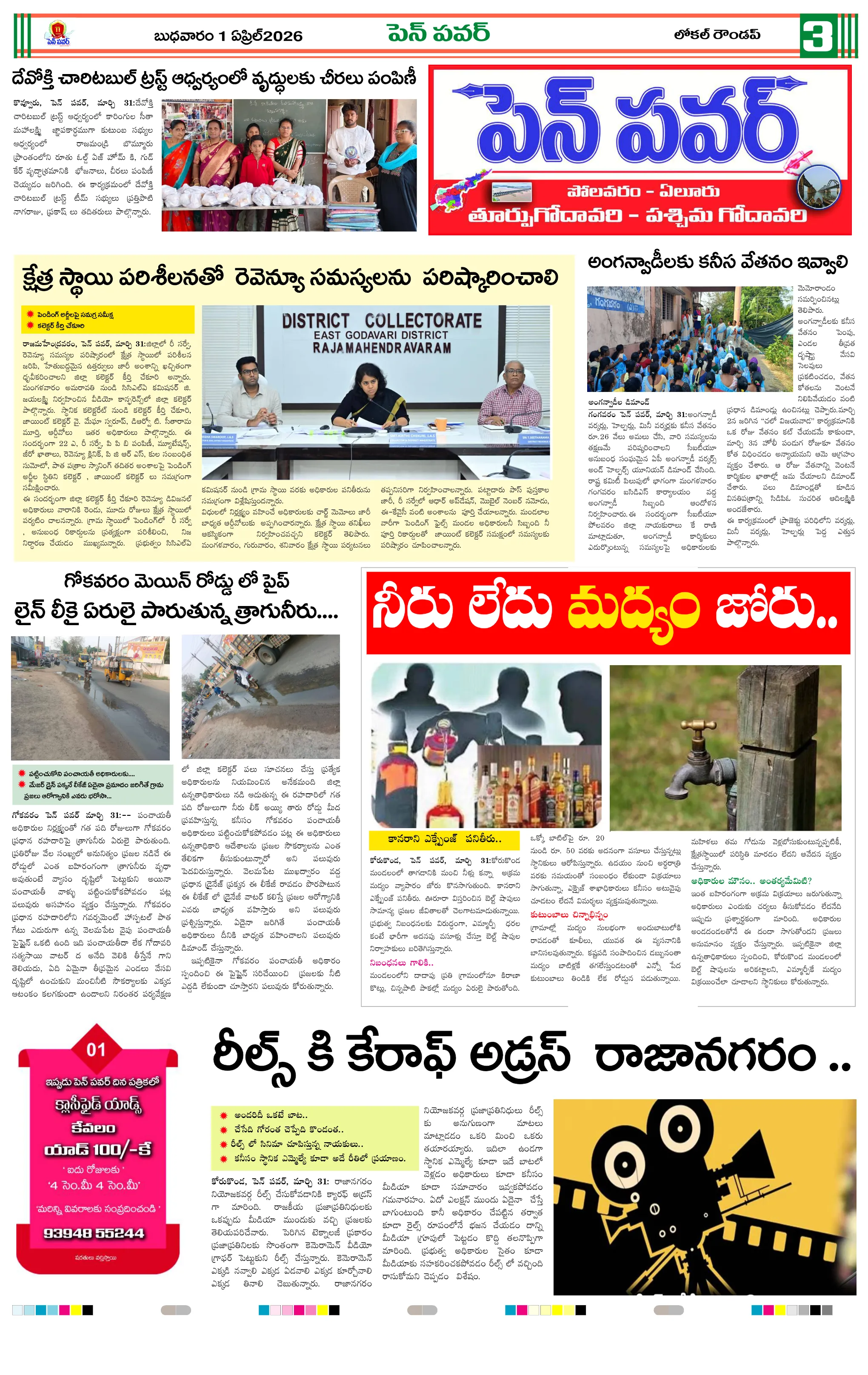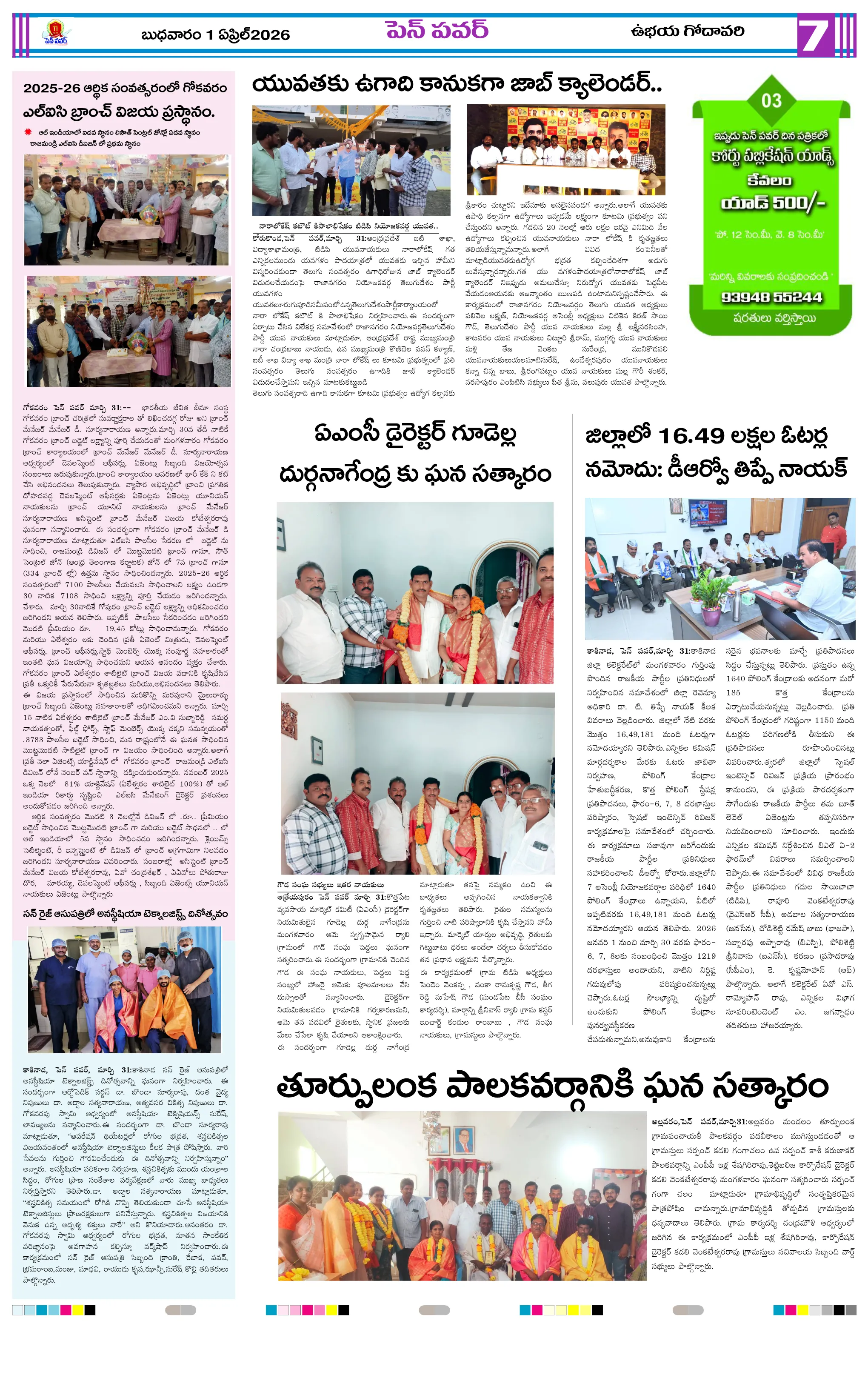 జాతీయ నేతల విగ్రహాల రక్షణకు పటిష్ట చర్యలుగ్రామాల అభివృద్ధికి ప్రత్యేక అధికారుల బాధ్యతల స్వీకారంగ్రామాల అభివృద్ధే లక్ష్యం!జగ్గంపేటలో పోలీసుల కార్డెన్ సెర్చ్మీ భూమి – మీ హక్కు కార్యక్రమంలో గిరిజన రైతులకు పట్టాల పంపిణీస్వర్ణ మొల్లేరు–జడేరు గ్రామాల్లో పర్యటించిన డిప్యూటీ ఎంపీడీవో గోపన్నదొరరెవెన్యూ సేవల్లో పారదర్శకతే ప్రభుత్వ లక్ష్యంగ్రామాభివృద్ధికి సమిష్టిగా సహకరించాలిఆరు పంచాయతీలకు ప్రత్యేక అధికారిగా అడ్డతీగల ఎంపీడీవో కుమార్..నీరులేని నీటి తొట్టెలు మూగజీవాల దాహార్తి తీరేదెలా?
