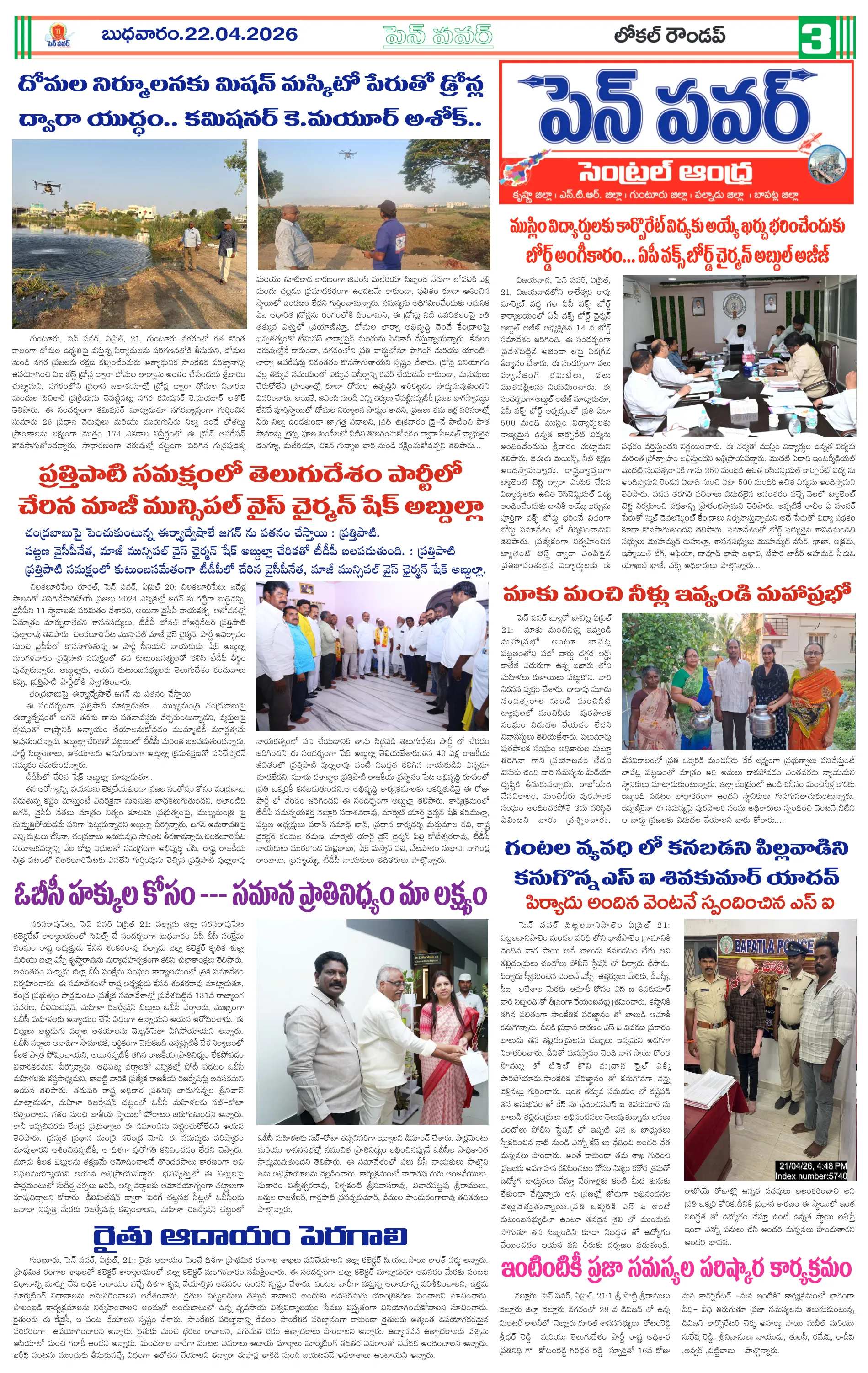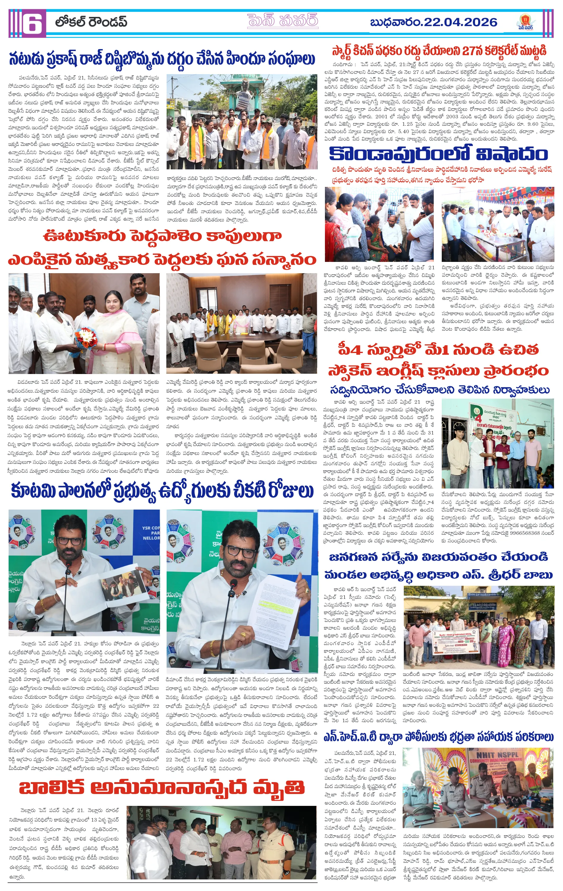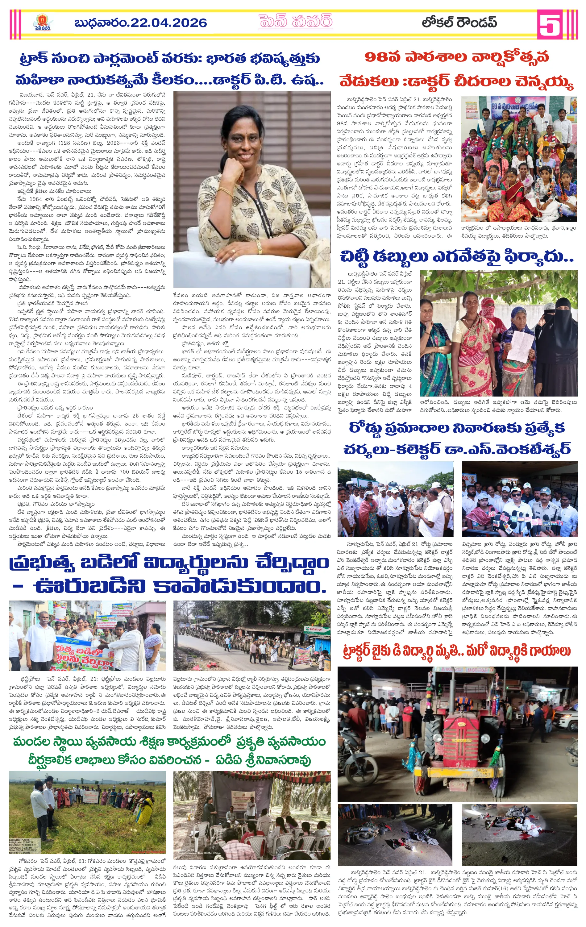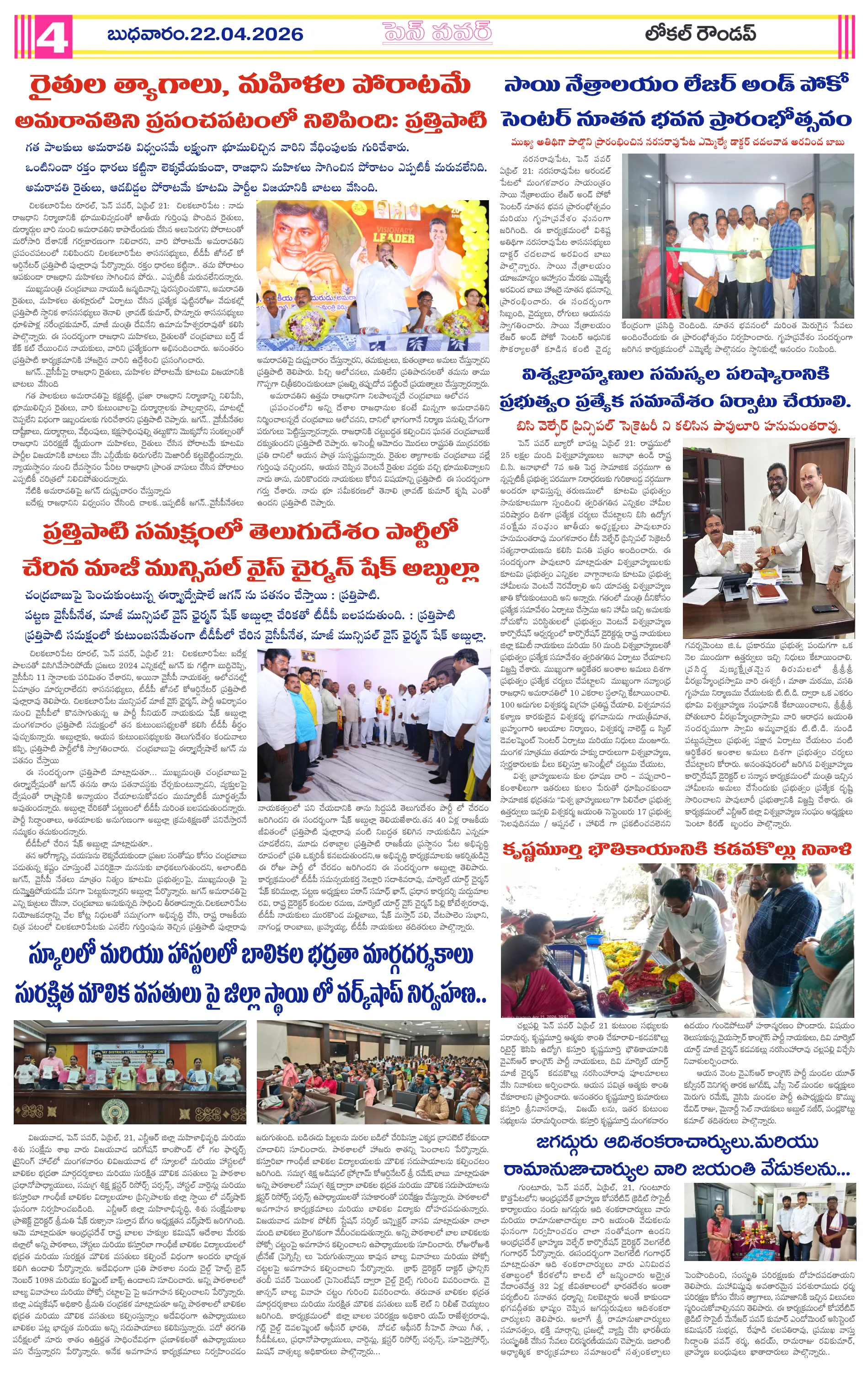 పవన్ కళ్యాణ్ ఆరోగ్యం కోసం ప్రత్యేక పూజలుపునరావాస కాలనీల్లోనే రేషన్ బియ్యం అందించాలని గిరిజనుల వినతికోలంక రైతు సేవ కేంద్రంలో ధాన్యం కొనుగోలు ప్రారంభం“అంబేద్కర్ అందరివాడు” మహాసభ గోడపత్రిక ఆవిష్కరణశ్రీ పరమేశ్వరానందగిరి స్వామీజీ ఆశీస్సులతోచింతూరులో ప్రజా ఫిర్యాదుల పరిష్కార కార్యక్రమంమరణించిన కార్యకర్త కుటుంబానికి రూ.5 లక్షల భీమామాజీ మంత్రి చిక్కాల లేఖకు స్పందించిన సీఎంసంక్షోభాలను సంకల్పాలుగా మార్చుకున్న నాయకుడు చంద్రబాబుగంగవరం లో పోషణ్ పక్వాడ కార్యక్రమం- అవగాహన ర్యాలీ