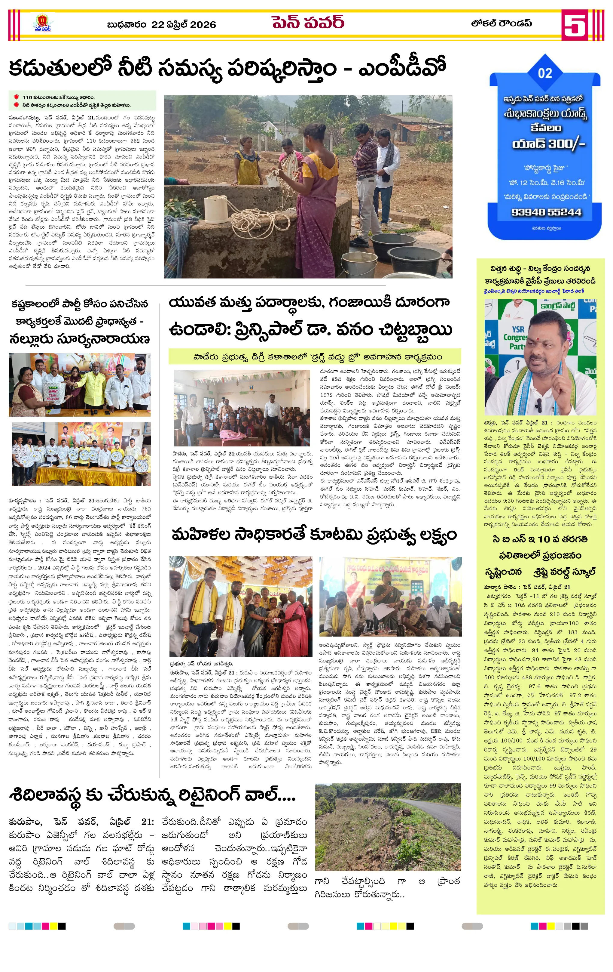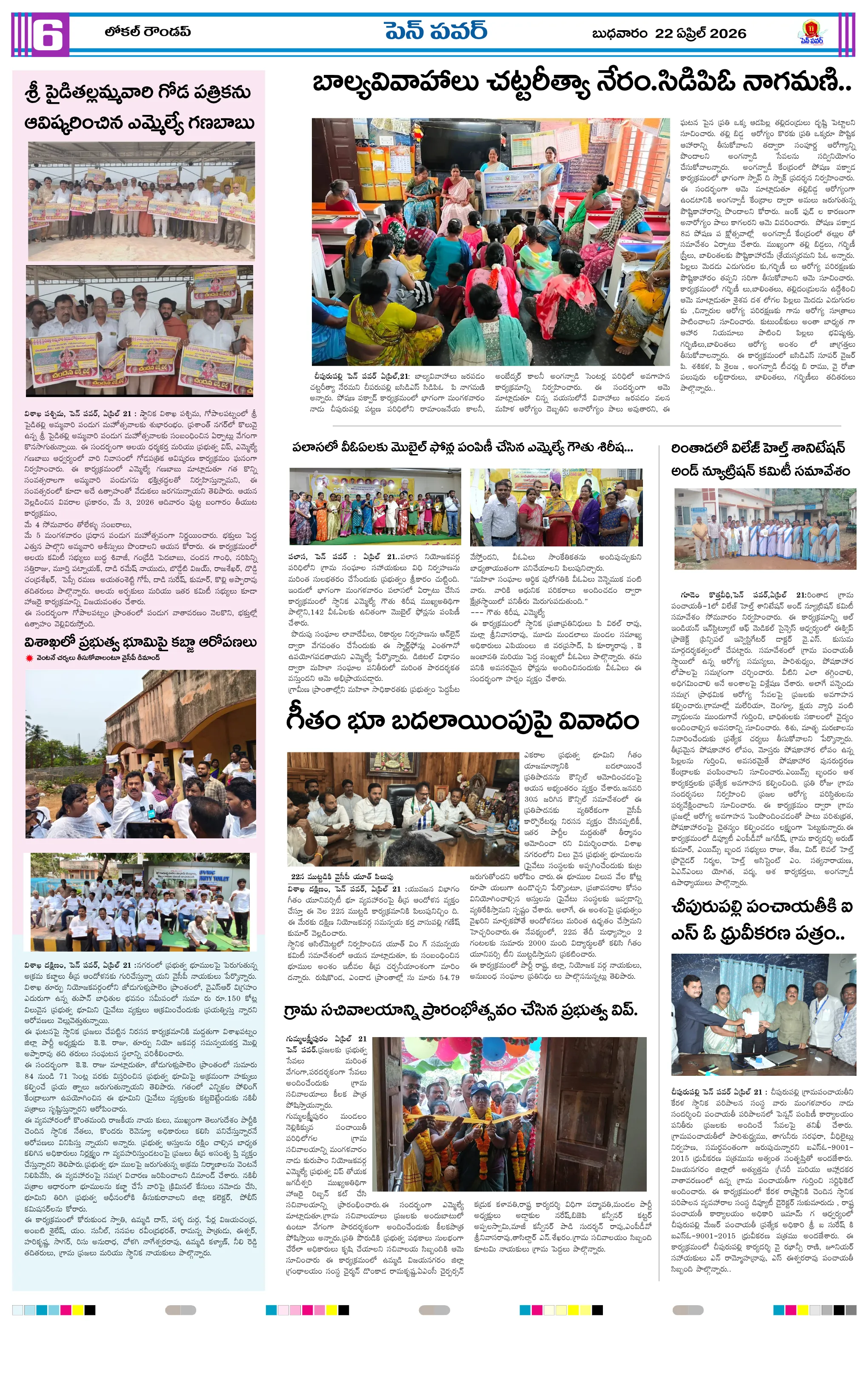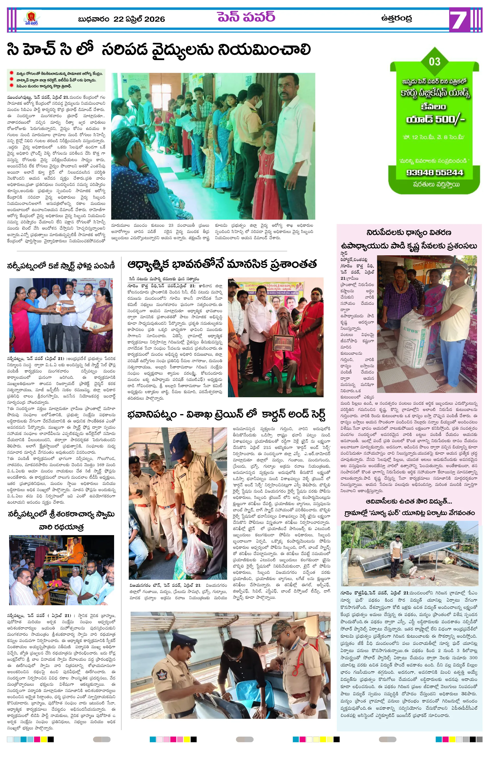 పవన్ కళ్యాణ్ ఆరోగ్యం కోసం ప్రత్యేక పూజలుపునరావాస కాలనీల్లోనే రేషన్ బియ్యం అందించాలని గిరిజనుల వినతికోలంక రైతు సేవ కేంద్రంలో ధాన్యం కొనుగోలు ప్రారంభం“అంబేద్కర్ అందరివాడు” మహాసభ గోడపత్రిక ఆవిష్కరణశ్రీ పరమేశ్వరానందగిరి స్వామీజీ ఆశీస్సులతోచింతూరులో ప్రజా ఫిర్యాదుల పరిష్కార కార్యక్రమంమరణించిన కార్యకర్త కుటుంబానికి రూ.5 లక్షల భీమామాజీ మంత్రి చిక్కాల లేఖకు స్పందించిన సీఎంసంక్షోభాలను సంకల్పాలుగా మార్చుకున్న నాయకుడు చంద్రబాబుగంగవరం లో పోషణ్ పక్వాడ కార్యక్రమం- అవగాహన ర్యాలీ