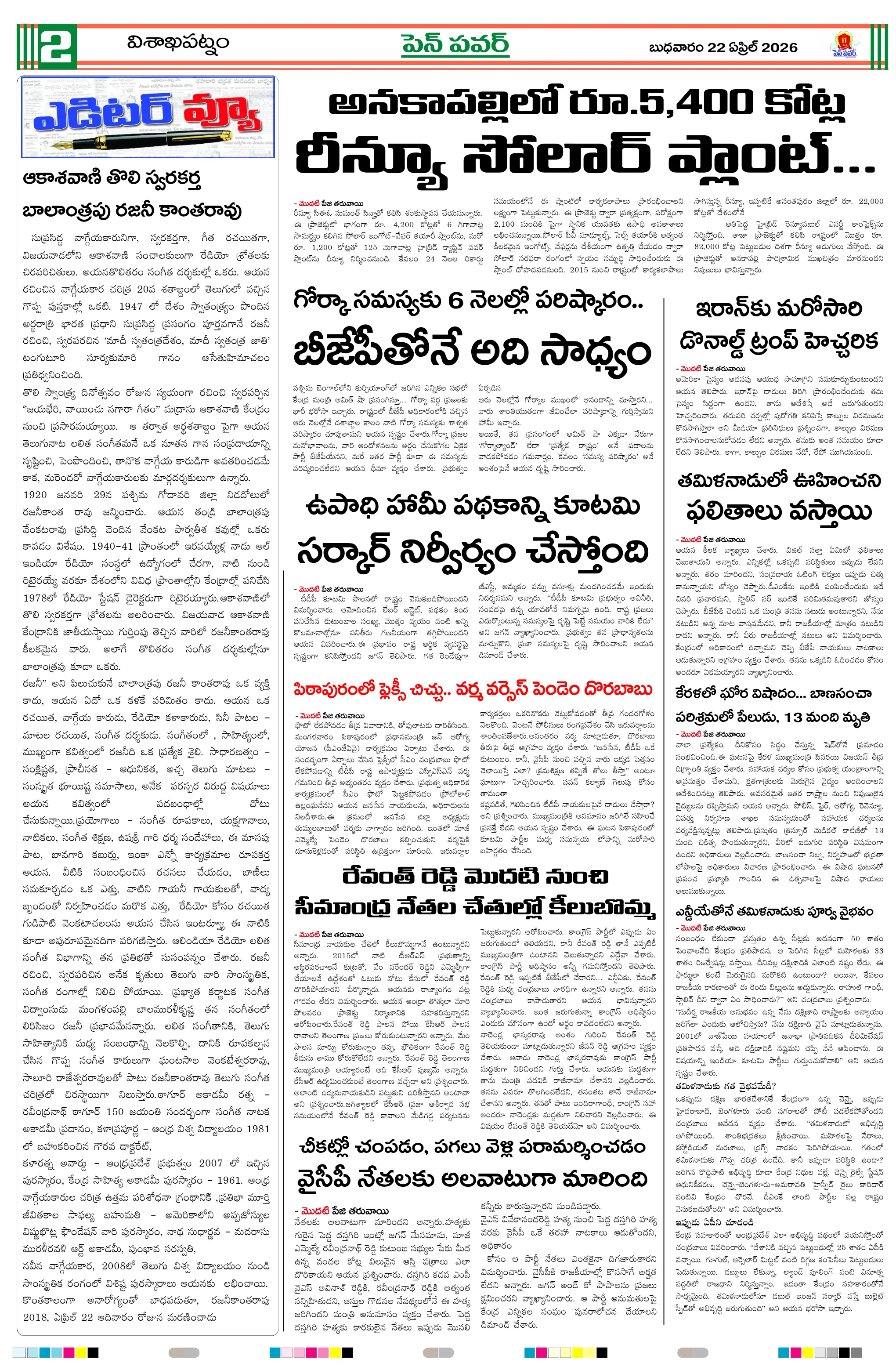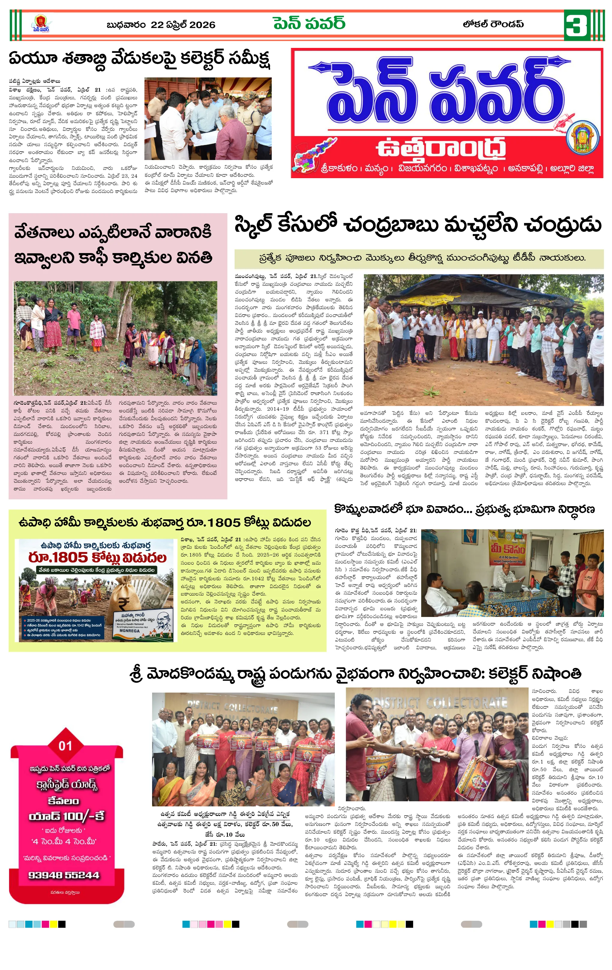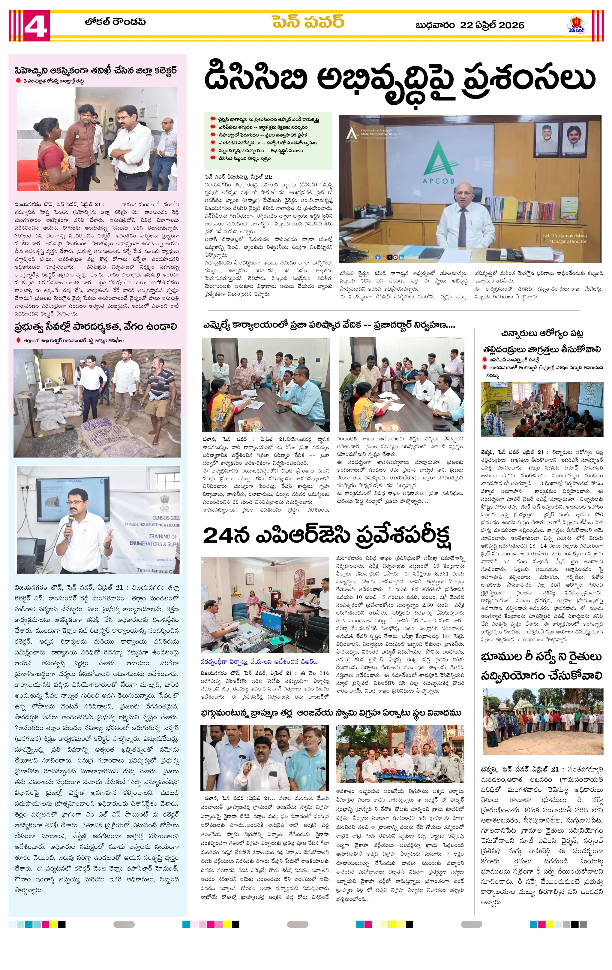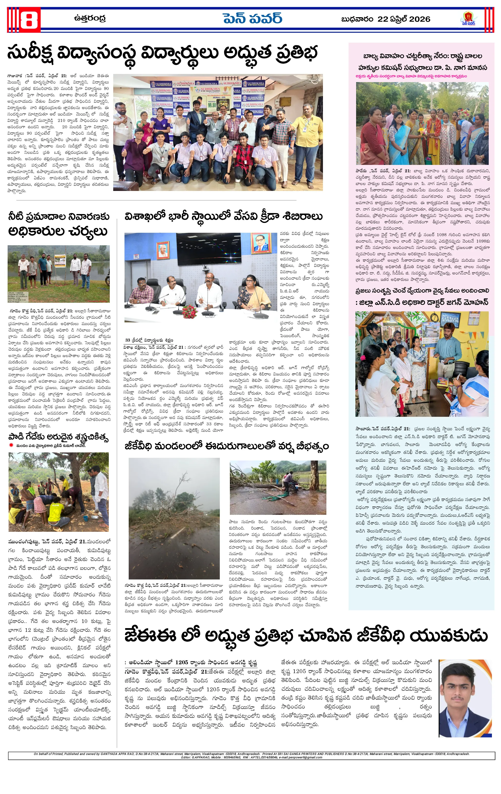 పవన్ కళ్యాణ్ ఆరోగ్యం కోసం ప్రత్యేక పూజలుపునరావాస కాలనీల్లోనే రేషన్ బియ్యం అందించాలని గిరిజనుల వినతికోలంక రైతు సేవ కేంద్రంలో ధాన్యం కొనుగోలు ప్రారంభం“అంబేద్కర్ అందరివాడు” మహాసభ గోడపత్రిక ఆవిష్కరణశ్రీ పరమేశ్వరానందగిరి స్వామీజీ ఆశీస్సులతోచింతూరులో ప్రజా ఫిర్యాదుల పరిష్కార కార్యక్రమంమరణించిన కార్యకర్త కుటుంబానికి రూ.5 లక్షల భీమామాజీ మంత్రి చిక్కాల లేఖకు స్పందించిన సీఎంసంక్షోభాలను సంకల్పాలుగా మార్చుకున్న నాయకుడు చంద్రబాబుగంగవరం లో పోషణ్ పక్వాడ కార్యక్రమం- అవగాహన ర్యాలీ