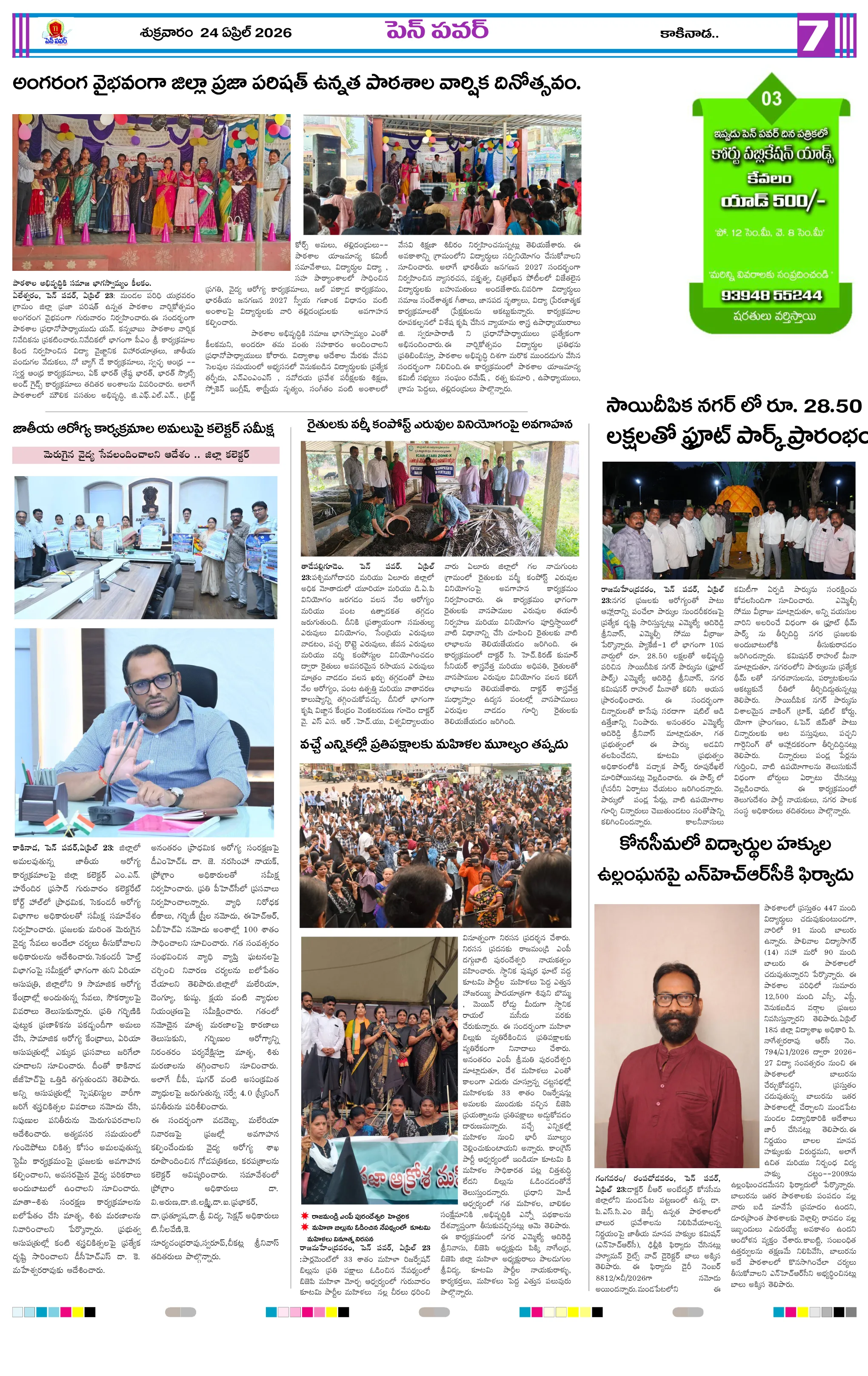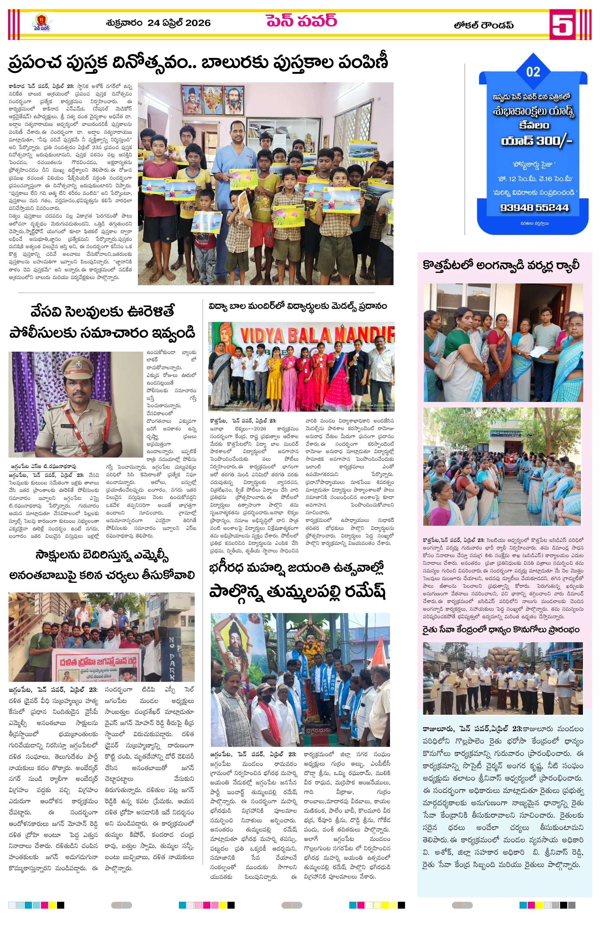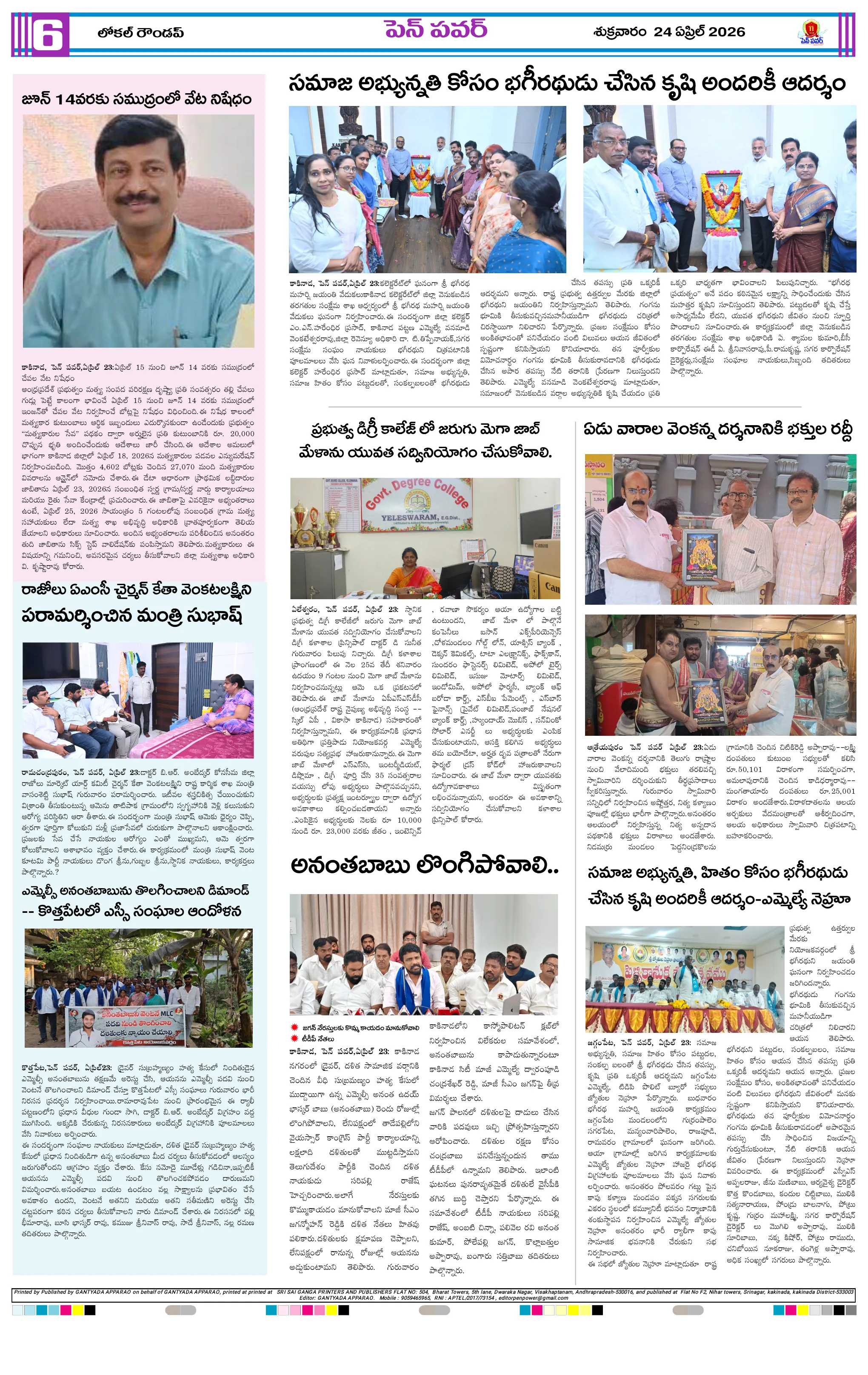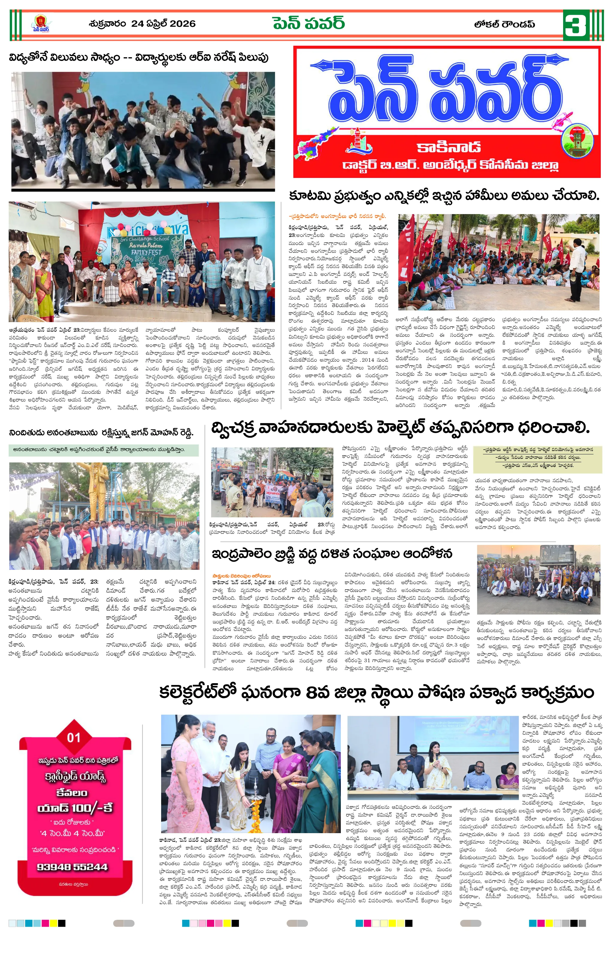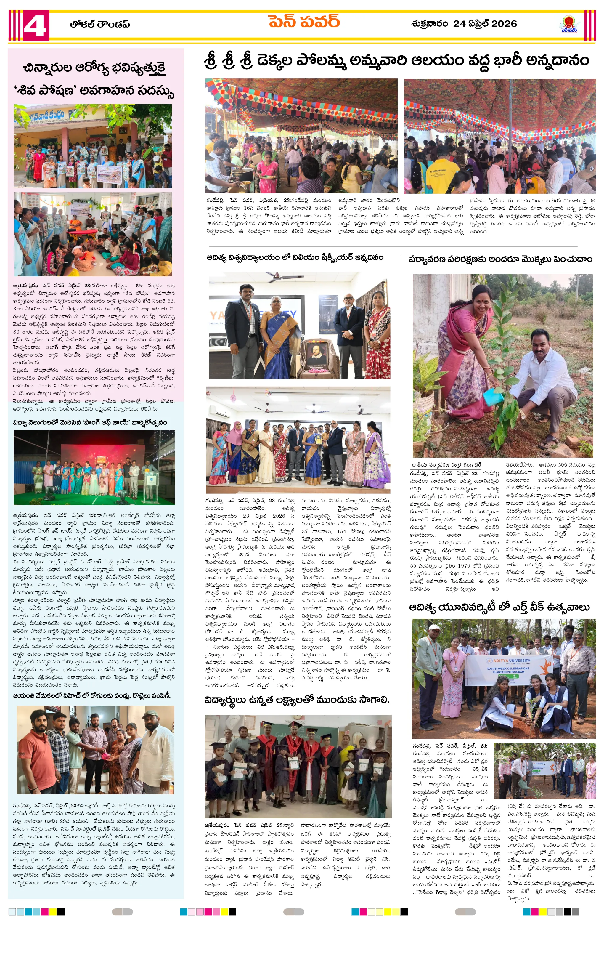 దళితుల సమస్యలపై ఐటిడిఏ పీఓ, డాక్టర్ జమాల్ ఖాన్‌ను కలిసిన సంఘ నాయకులుప్రైవేట్ పాఠశాలలకు దీటుగా ప్రభుత్వ పాఠశాలలో విద్యాబోధననల్లబెల్లి జలపాతం వద్ద హెచ్చరిక బోర్డు ఏర్పాటుభారీ వర్షాలకు ఇల్లు కోల్పోయిన బాధితుడికి సహాయం చేయాలిఅధికారులపై కోర్టు ధిక్కరణ కేసు నమోదు చేయాలిప్రజా ఆస్తుల లీజింగ్‌పై వివాదం స్టేడియాల్లో వాకింగ్‌కూ ఫీజులపై ఆందోళనఏప్రిల్ 24 న దామనపల్లి సచివాలయంలో గ్రామసభ  పవన్ కళ్యాణ్ ఆరోగ్యం కోసం ప్రత్యేక పూజలుపునరావాస కాలనీల్లోనే రేషన్ బియ్యం అందించాలని గిరిజనుల వినతికోలంక రైతు సేవ కేంద్రంలో ధాన్యం కొనుగోలు ప్రారంభం