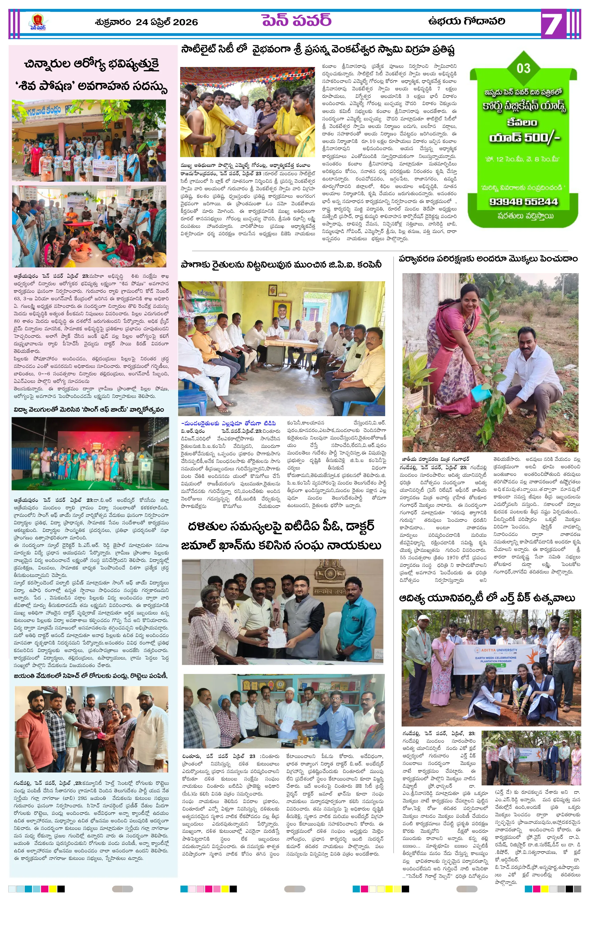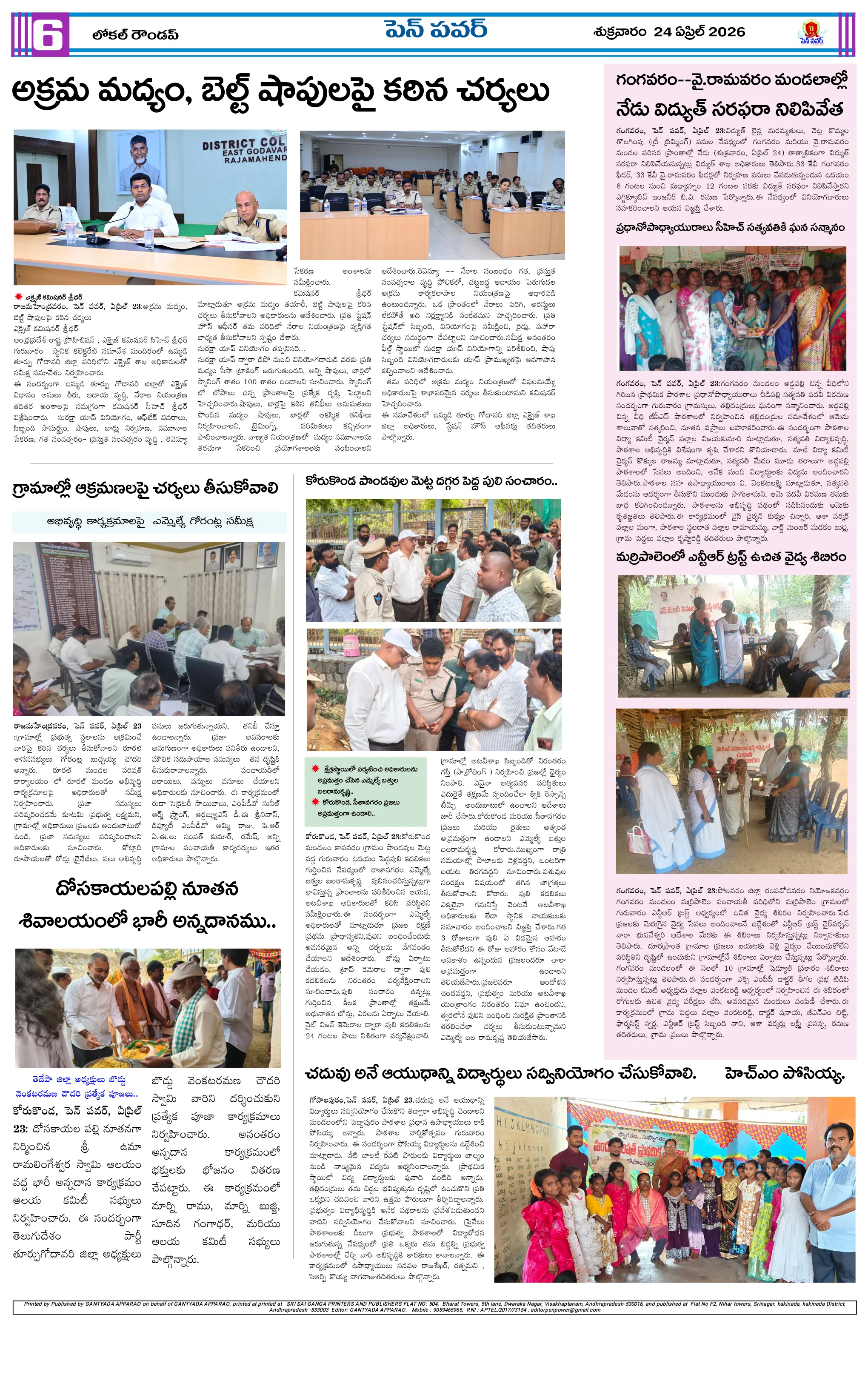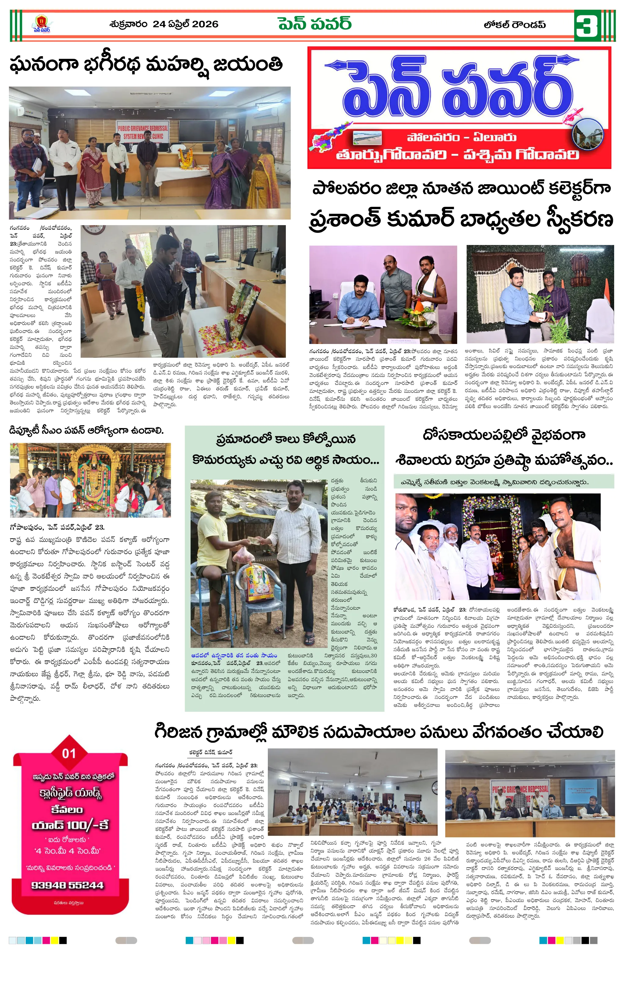 దళితుల సమస్యలపై ఐటిడిఏ పీఓ, డాక్టర్ జమాల్ ఖాన్‌ను కలిసిన సంఘ నాయకులుప్రైవేట్ పాఠశాలలకు దీటుగా ప్రభుత్వ పాఠశాలలో విద్యాబోధననల్లబెల్లి జలపాతం వద్ద హెచ్చరిక బోర్డు ఏర్పాటుభారీ వర్షాలకు ఇల్లు కోల్పోయిన బాధితుడికి సహాయం చేయాలిఅధికారులపై కోర్టు ధిక్కరణ కేసు నమోదు చేయాలిప్రజా ఆస్తుల లీజింగ్‌పై వివాదం స్టేడియాల్లో వాకింగ్‌కూ ఫీజులపై ఆందోళనఏప్రిల్ 24 న దామనపల్లి సచివాలయంలో గ్రామసభ  పవన్ కళ్యాణ్ ఆరోగ్యం కోసం ప్రత్యేక పూజలుపునరావాస కాలనీల్లోనే రేషన్ బియ్యం అందించాలని గిరిజనుల వినతికోలంక రైతు సేవ కేంద్రంలో ధాన్యం కొనుగోలు ప్రారంభం