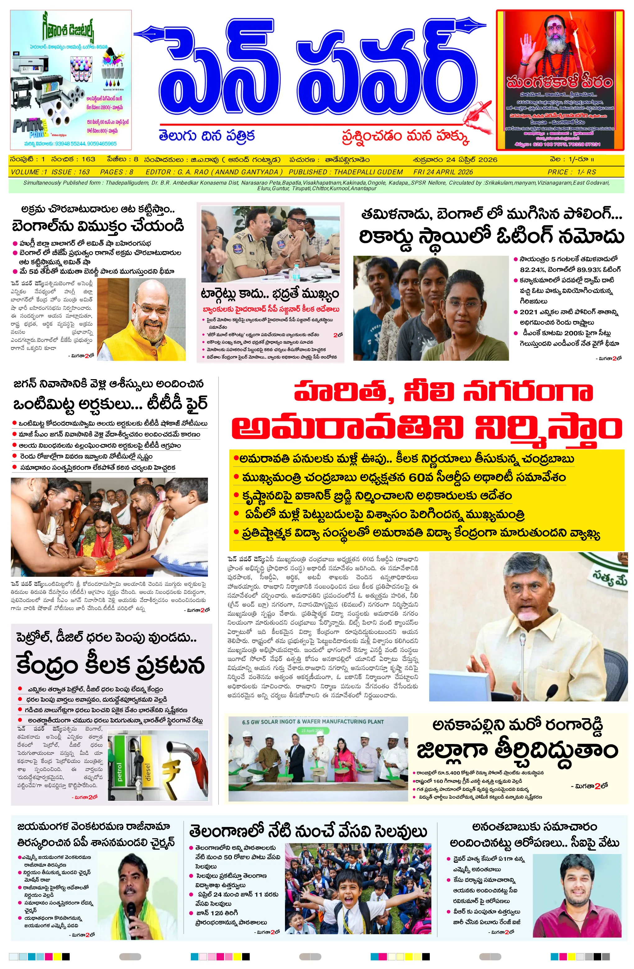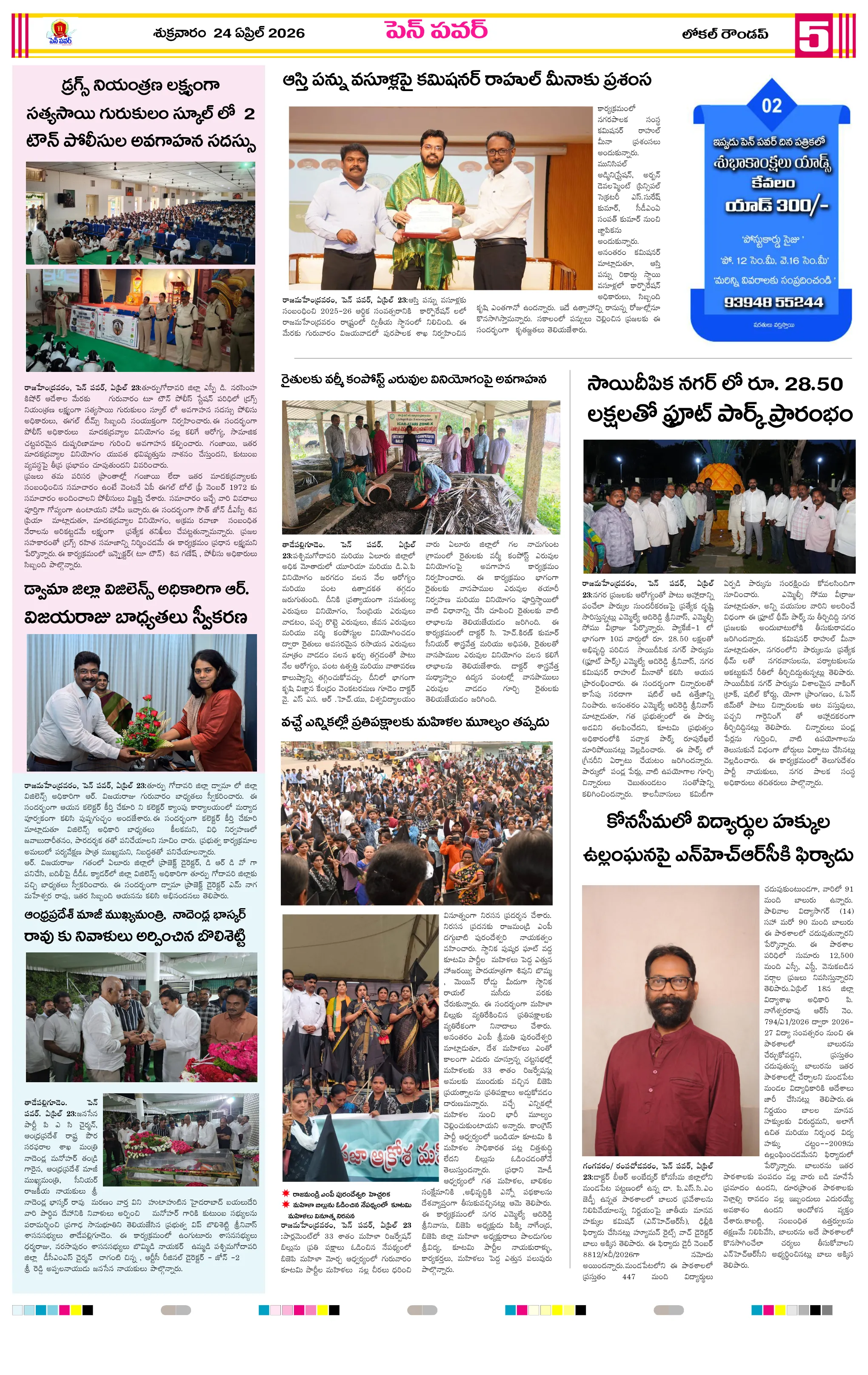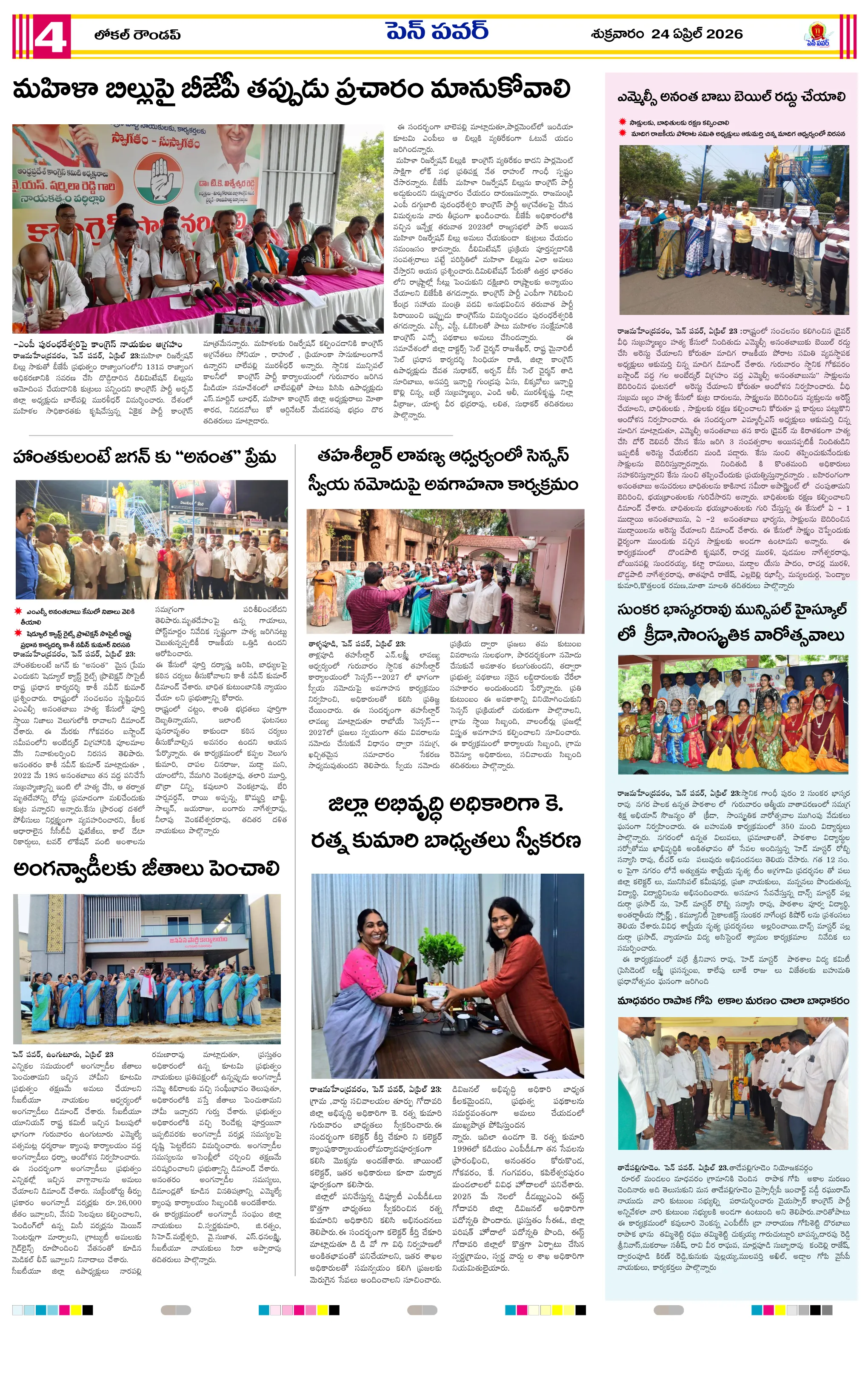 దళితుల సమస్యలపై ఐటిడిఏ పీఓ, డాక్టర్ జమాల్ ఖాన్‌ను కలిసిన సంఘ నాయకులుప్రైవేట్ పాఠశాలలకు దీటుగా ప్రభుత్వ పాఠశాలలో విద్యాబోధననల్లబెల్లి జలపాతం వద్ద హెచ్చరిక బోర్డు ఏర్పాటుభారీ వర్షాలకు ఇల్లు కోల్పోయిన బాధితుడికి సహాయం చేయాలిఅధికారులపై కోర్టు ధిక్కరణ కేసు నమోదు చేయాలిప్రజా ఆస్తుల లీజింగ్‌పై వివాదం స్టేడియాల్లో వాకింగ్‌కూ ఫీజులపై ఆందోళనఏప్రిల్ 24 న దామనపల్లి సచివాలయంలో గ్రామసభ  పవన్ కళ్యాణ్ ఆరోగ్యం కోసం ప్రత్యేక పూజలుపునరావాస కాలనీల్లోనే రేషన్ బియ్యం అందించాలని గిరిజనుల వినతికోలంక రైతు సేవ కేంద్రంలో ధాన్యం కొనుగోలు ప్రారంభం