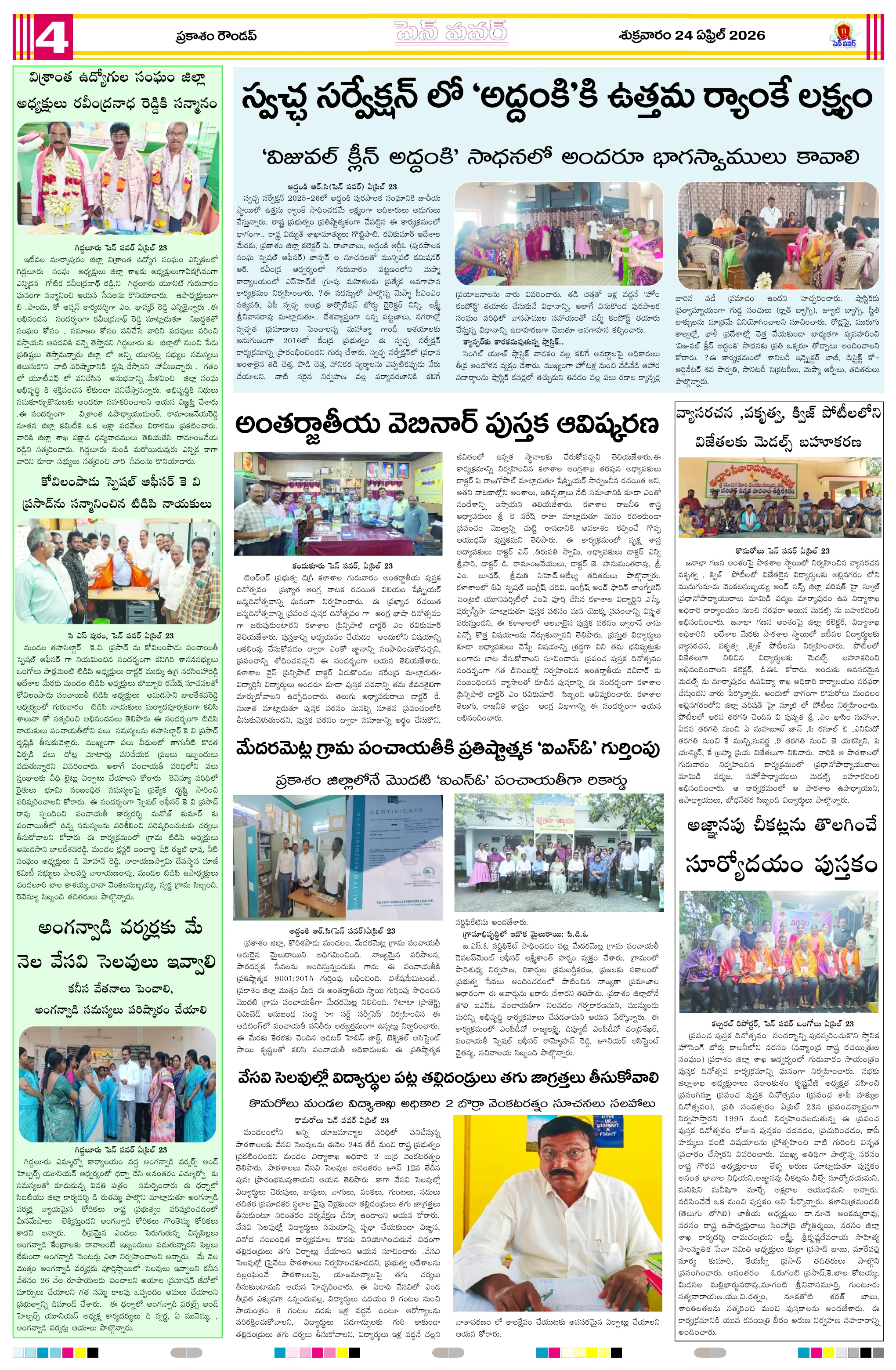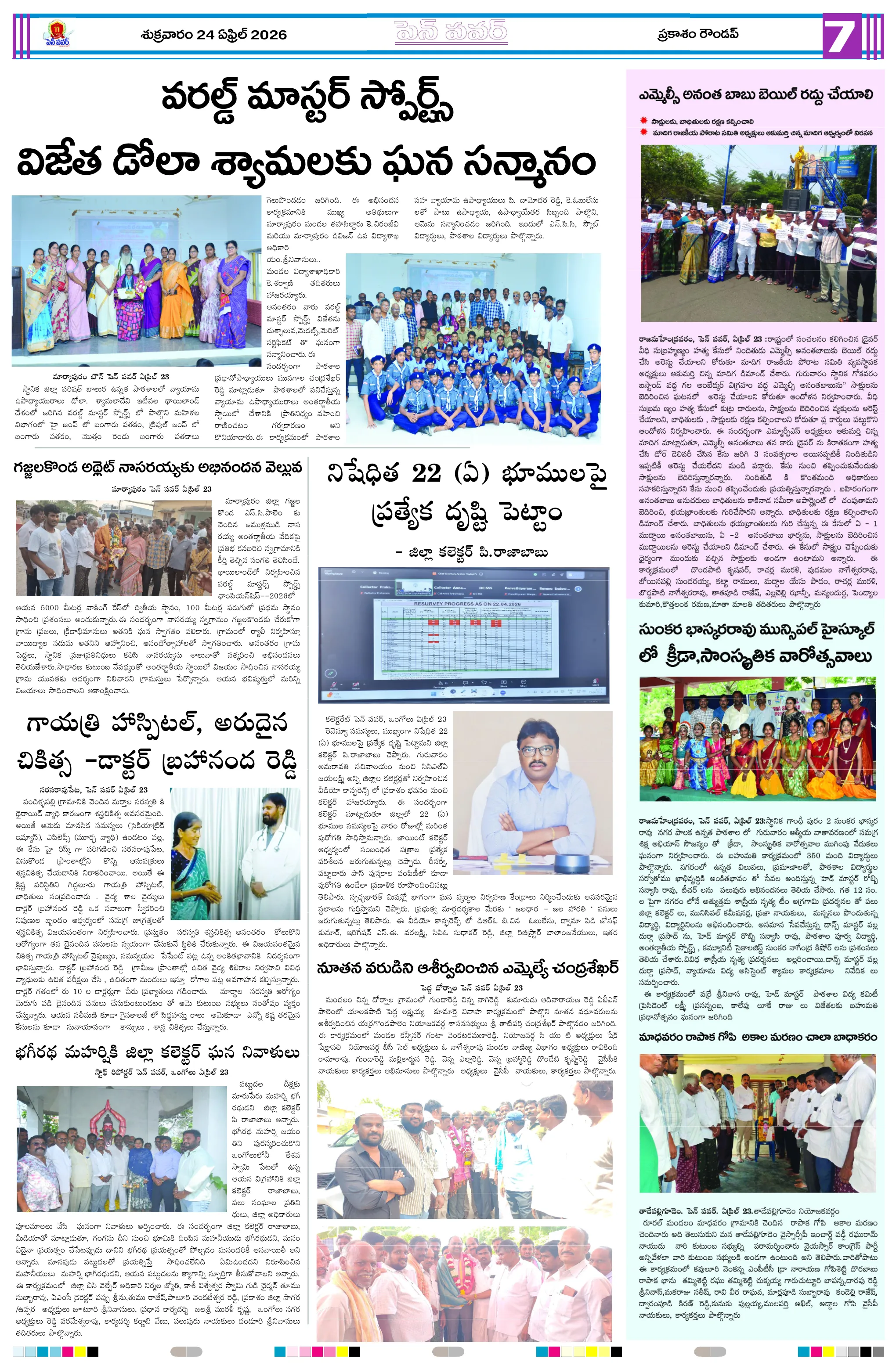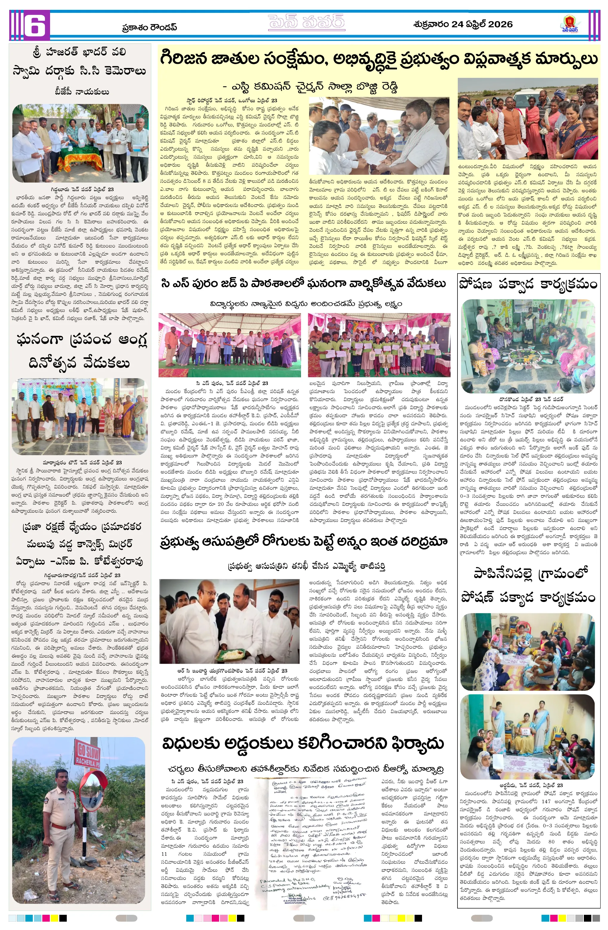 దళితుల సమస్యలపై ఐటిడిఏ పీఓ, డాక్టర్ జమాల్ ఖాన్‌ను కలిసిన సంఘ నాయకులుప్రైవేట్ పాఠశాలలకు దీటుగా ప్రభుత్వ పాఠశాలలో విద్యాబోధననల్లబెల్లి జలపాతం వద్ద హెచ్చరిక బోర్డు ఏర్పాటుభారీ వర్షాలకు ఇల్లు కోల్పోయిన బాధితుడికి సహాయం చేయాలిఅధికారులపై కోర్టు ధిక్కరణ కేసు నమోదు చేయాలిప్రజా ఆస్తుల లీజింగ్‌పై వివాదం స్టేడియాల్లో వాకింగ్‌కూ ఫీజులపై ఆందోళనఏప్రిల్ 24 న దామనపల్లి సచివాలయంలో గ్రామసభ  పవన్ కళ్యాణ్ ఆరోగ్యం కోసం ప్రత్యేక పూజలుపునరావాస కాలనీల్లోనే రేషన్ బియ్యం అందించాలని గిరిజనుల వినతికోలంక రైతు సేవ కేంద్రంలో ధాన్యం కొనుగోలు ప్రారంభం
