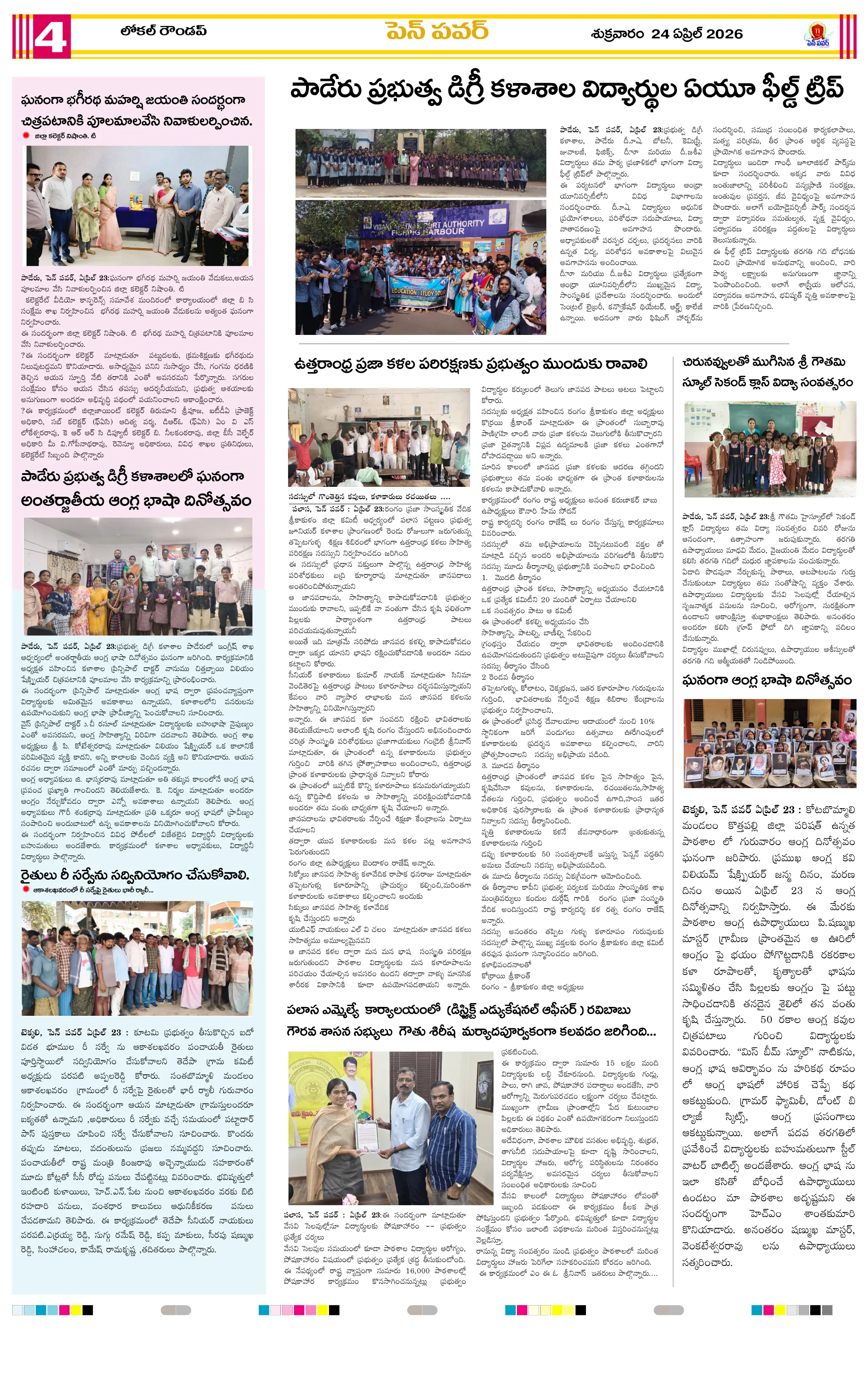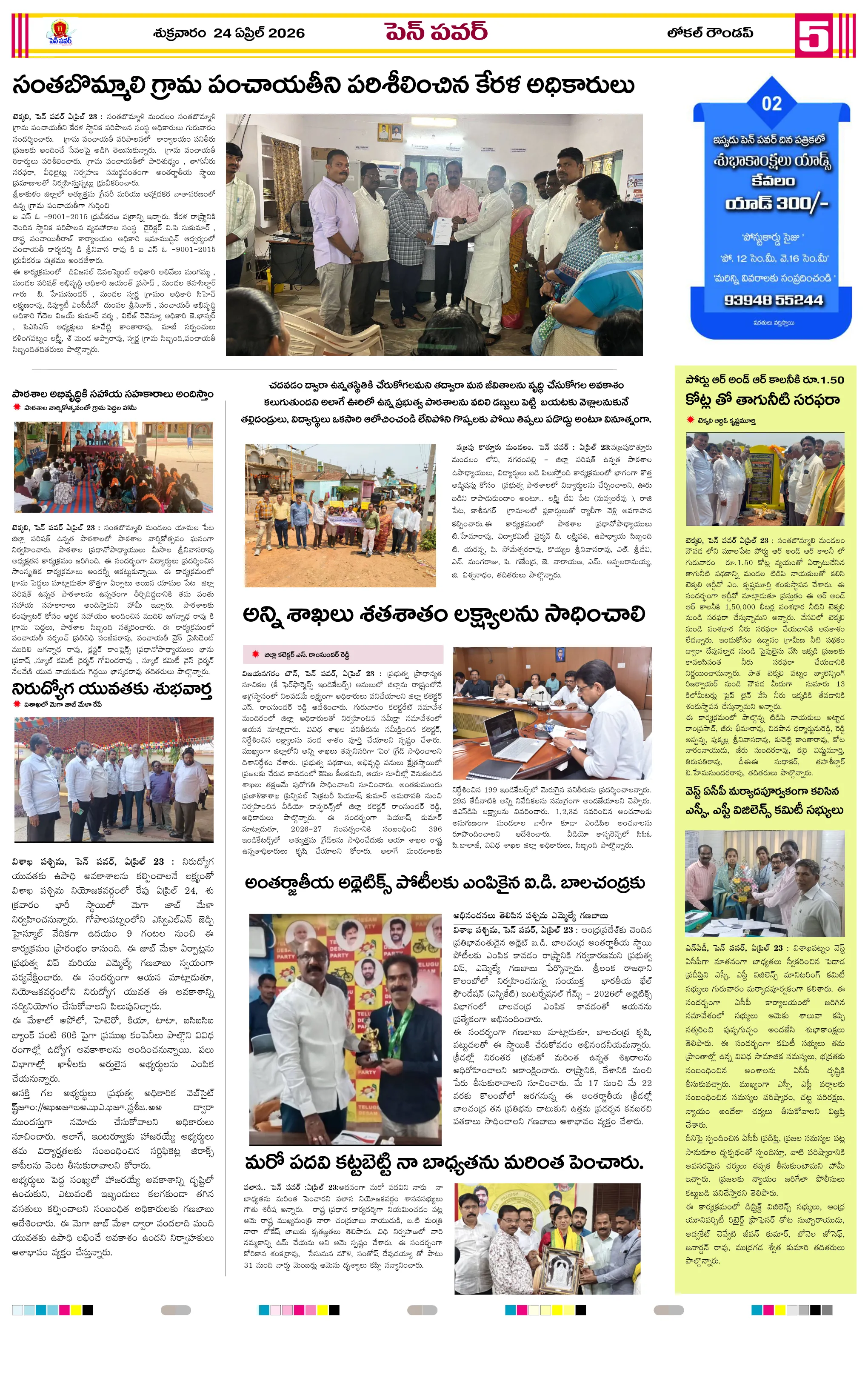 దళితుల సమస్యలపై ఐటిడిఏ పీఓ, డాక్టర్ జమాల్ ఖాన్‌ను కలిసిన సంఘ నాయకులుప్రైవేట్ పాఠశాలలకు దీటుగా ప్రభుత్వ పాఠశాలలో విద్యాబోధననల్లబెల్లి జలపాతం వద్ద హెచ్చరిక బోర్డు ఏర్పాటుభారీ వర్షాలకు ఇల్లు కోల్పోయిన బాధితుడికి సహాయం చేయాలిఅధికారులపై కోర్టు ధిక్కరణ కేసు నమోదు చేయాలిప్రజా ఆస్తుల లీజింగ్‌పై వివాదం స్టేడియాల్లో వాకింగ్‌కూ ఫీజులపై ఆందోళనఏప్రిల్ 24 న దామనపల్లి సచివాలయంలో గ్రామసభ  పవన్ కళ్యాణ్ ఆరోగ్యం కోసం ప్రత్యేక పూజలుపునరావాస కాలనీల్లోనే రేషన్ బియ్యం అందించాలని గిరిజనుల వినతికోలంక రైతు సేవ కేంద్రంలో ధాన్యం కొనుగోలు ప్రారంభం