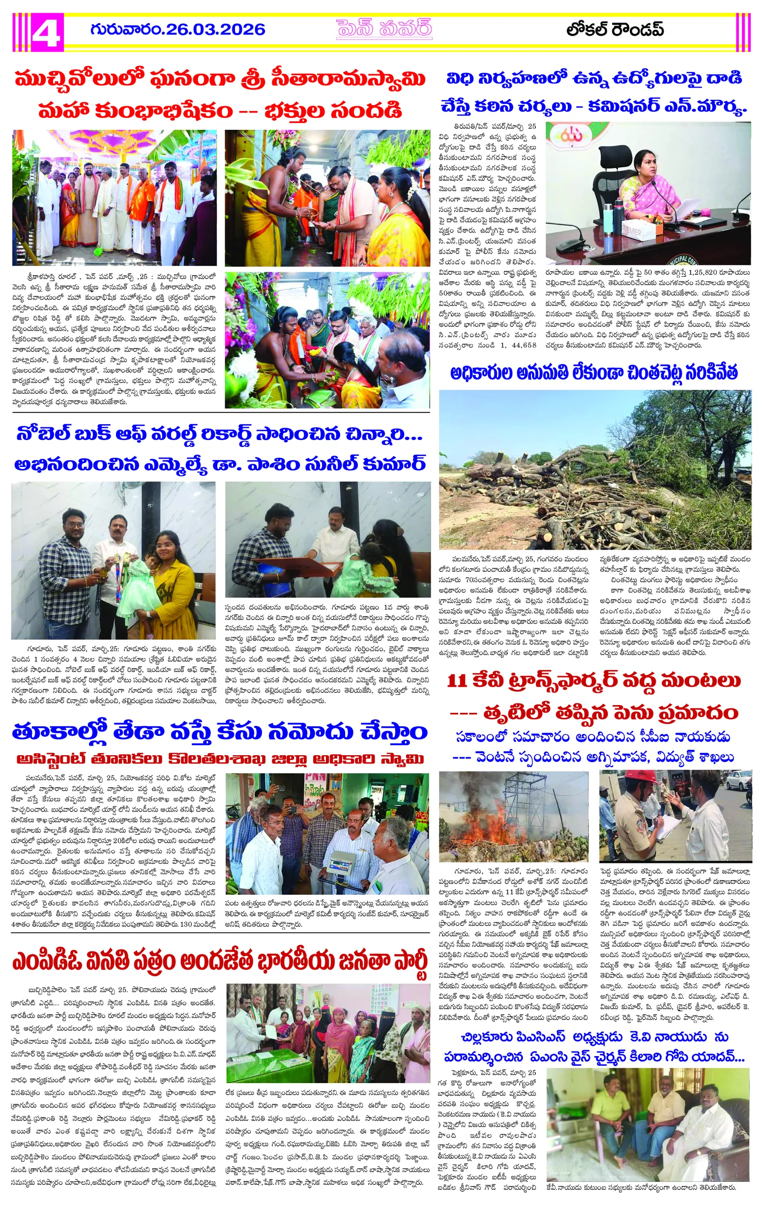 పేద గిరిజన విద్యార్థులకు గ్రూప్స్ మెటీరియల్ అందజేసిన ఉప తహసీల్దార్ ఏప్రిల్ 15న పంచాయతీ కేంద్రాల్లో ఓటర్ జాబితా ప్రదర్శననిబందనలు మాకు వర్తించవు ఆక్రమార్కులు అల్టీమేటంరాజ్యాధికారమే మాస్టర్ కి : డాక్టర్ తెన్నేటి జయరాజ్సంకాడ పంచాయతీలో ఘనంగా అంబేద్కర్ జయంతి వేడుకలుకూటమినేతల సమక్షంలో జీకే వీధిలో  ఘనంగా డాక్టర్ బి.ఆర్. అంబేద్కర్ జయంతి జర్నలిస్టుల ఆధ్వర్యంలో అంబేడ్కర్‌ జయంతి వేడుకలుఇష్యూ బేస్డ్ ఉద్యమాలతో జగన్ కొత్త వ్యూహంసింగపూర్ లో ట్రైనింగ్ కు మంత్రులుడా.బిఆర్.అంబేద్కర్ కు ఘన నివాళులు అర్పించిన స్పీకర్, హోం మంత్రి