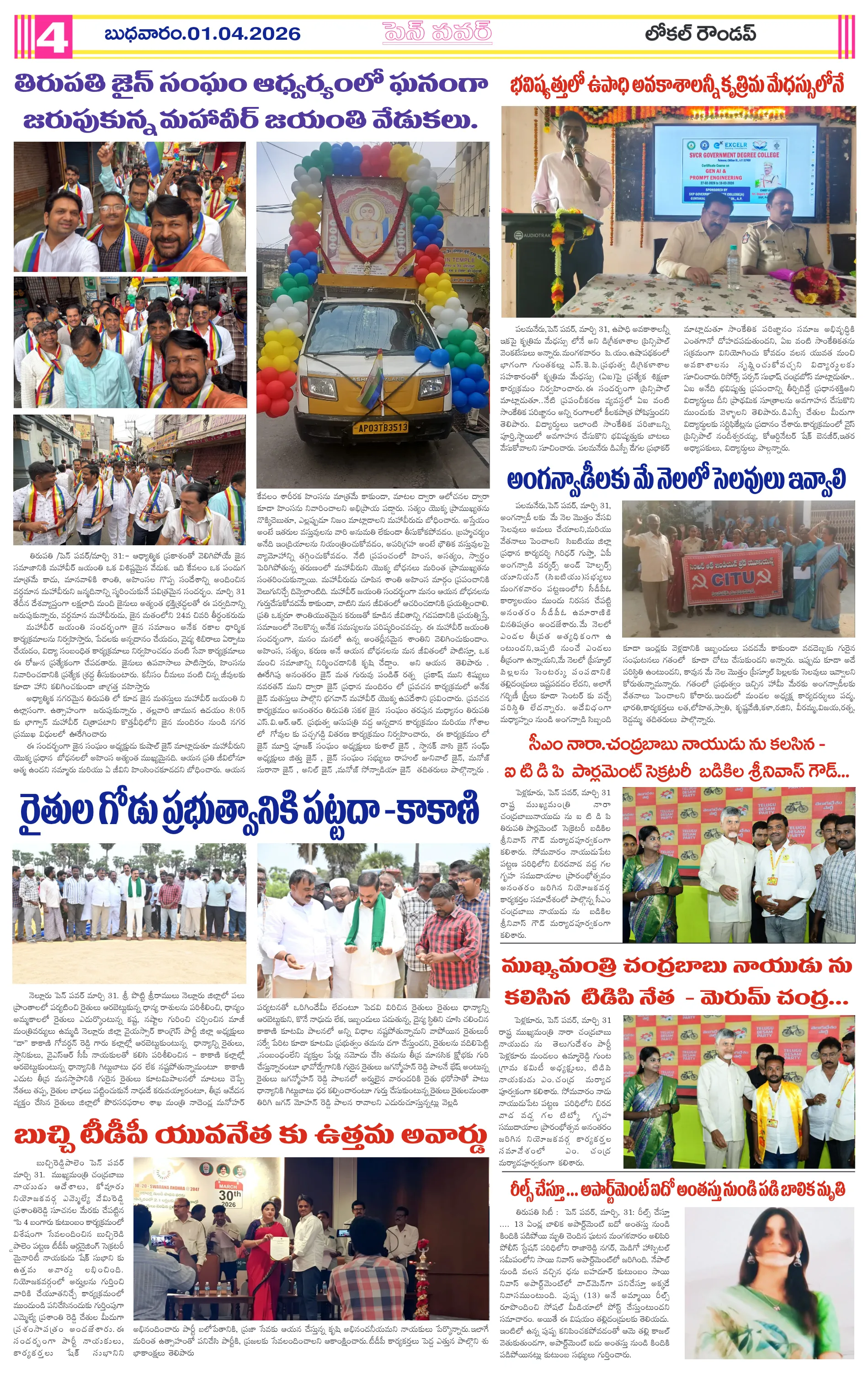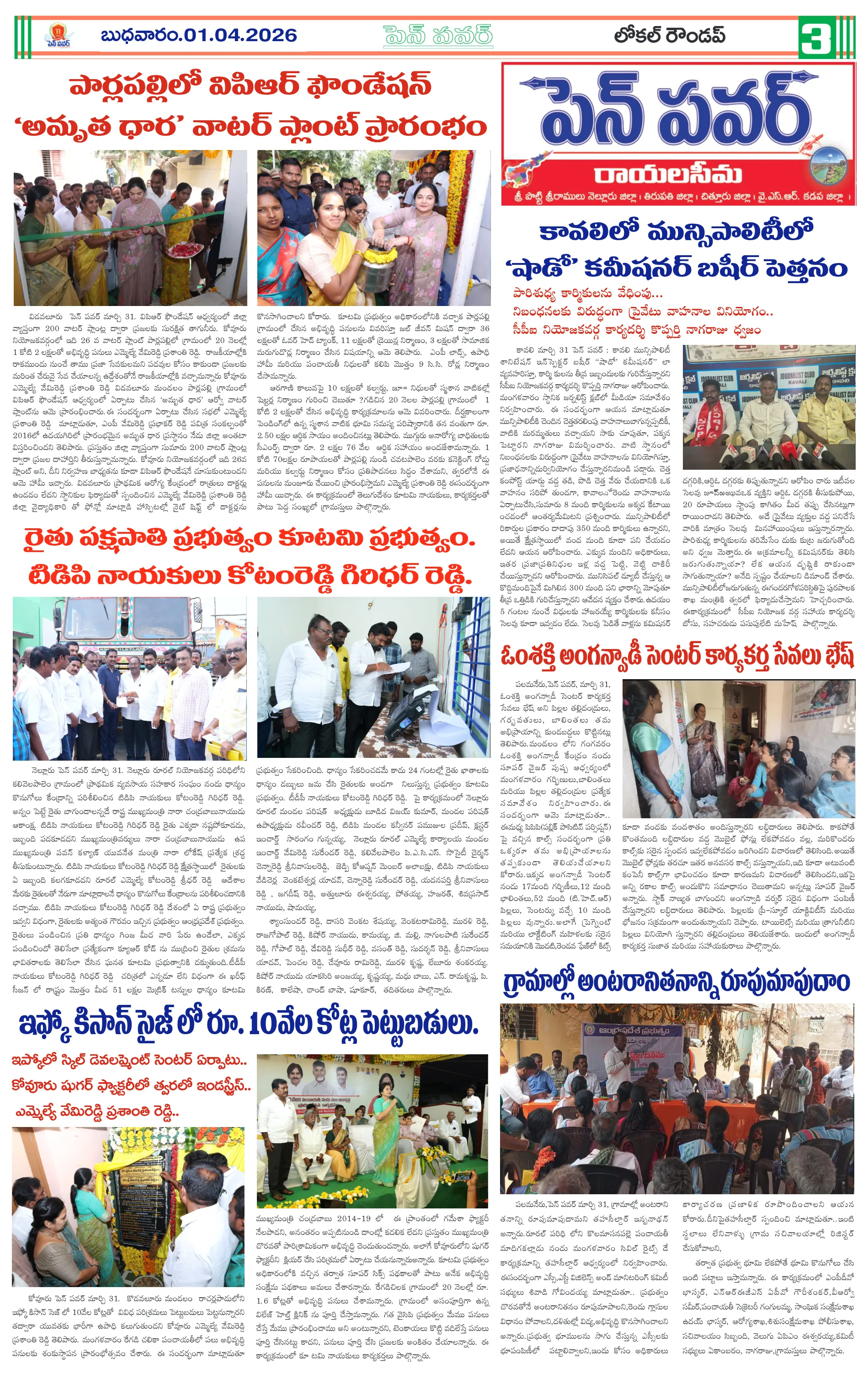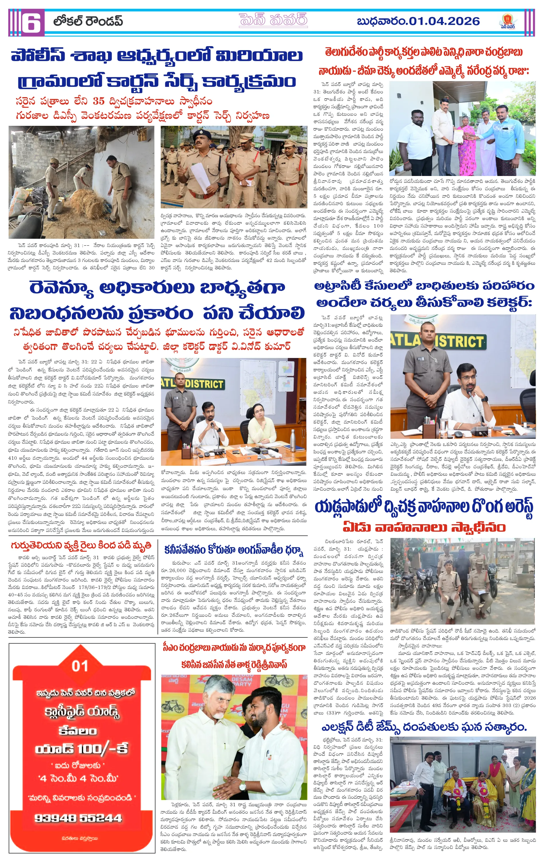 ఏపీలో మరో 30 ఇండస్ట్రియల్ క్లస్టర్లకు గ్రీన్ సిగ్నల్మంత్రులపై చంద్రబాబు ఆగ్రహంపార్టీలకు అతీతంగా అంబేద్కర్ జయంతి వేడుకలుజనగణన మొదటి విడత శిక్షణ ప్రారంభం:తహసీల్దార్ హెచ్. అన్నాజీ రావుఅంబేద్కర్ జయంతి ఏర్పాట్లపై పోలీసుల పర్యవేక్షణమహిళలు స్వయం సమృద్ధి సాధించాలి…కూటమి ప్రభుత్వంలో గ్యాస్ కొరత సామాన్యుల తిప్పలు పట్టవా:వైసిపి మండల ఉపాధ్యక్షులు వంతల అరుణ్ ఆగ్రహం.మండల కేంద్రాల్లో ప్రతి సోమవారం ‘గ్రీవెన్స్ డే’ తప్పనిసరి:జిల్లా కలెక్టర్ నిశాంతిసిమెంట్ లారీ బోల్తా…తప్పిన పెను ప్రమాదం..!సమస్యల పరిష్కారానికి మండల కేంద్రంలో సోమవారం ‘మీ కోసం’ కార్యక్రమం