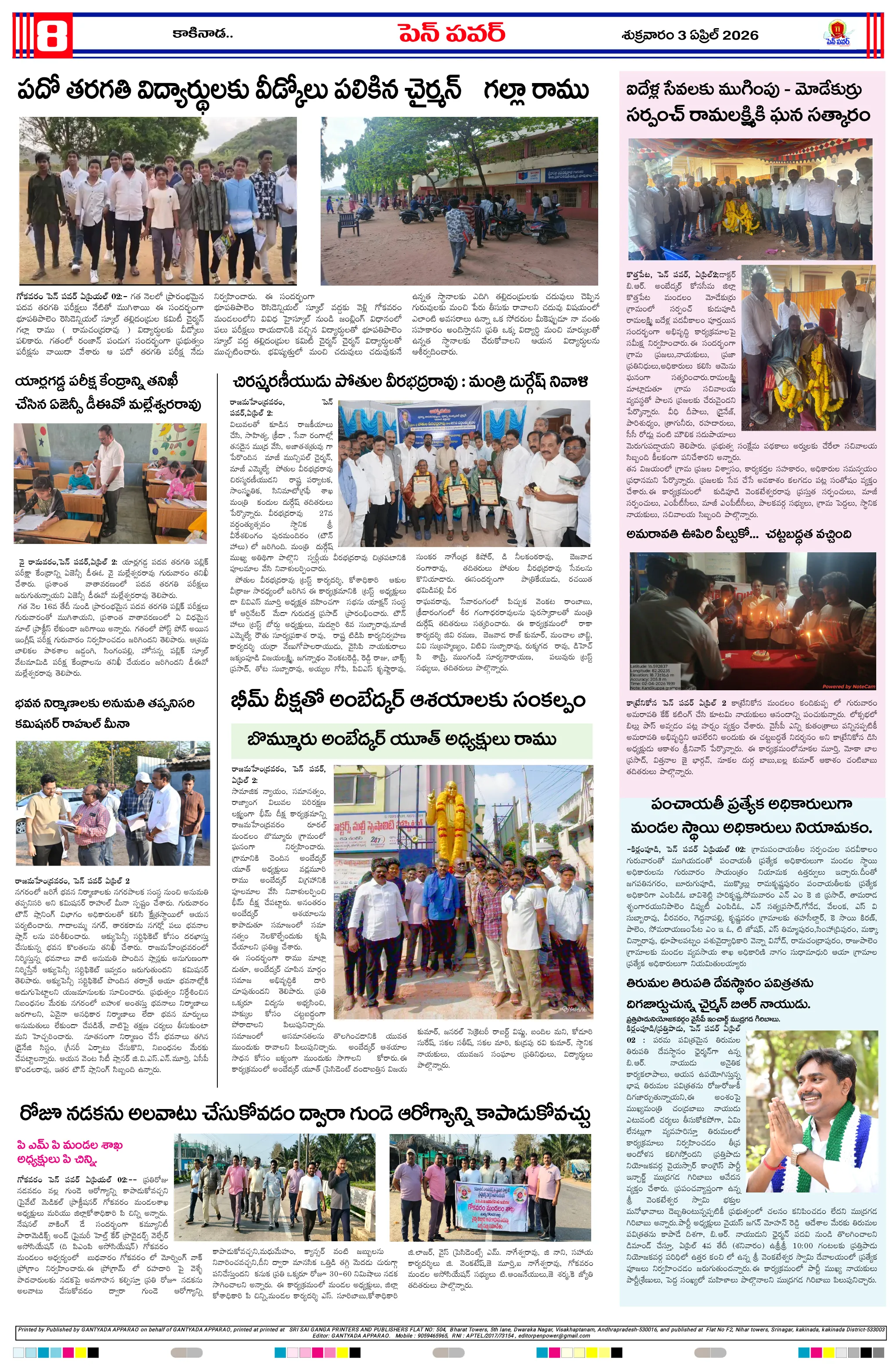 పేద గిరిజన విద్యార్థులకు గ్రూప్స్ మెటీరియల్ అందజేసిన ఉప తహసీల్దార్ ఏప్రిల్ 15న పంచాయతీ కేంద్రాల్లో ఓటర్ జాబితా ప్రదర్శననిబందనలు మాకు వర్తించవు ఆక్రమార్కులు అల్టీమేటంరాజ్యాధికారమే మాస్టర్ కి : డాక్టర్ తెన్నేటి జయరాజ్సంకాడ పంచాయతీలో ఘనంగా అంబేద్కర్ జయంతి వేడుకలుకూటమినేతల సమక్షంలో జీకే వీధిలో  ఘనంగా డాక్టర్ బి.ఆర్. అంబేద్కర్ జయంతి జర్నలిస్టుల ఆధ్వర్యంలో అంబేడ్కర్‌ జయంతి వేడుకలుఇష్యూ బేస్డ్ ఉద్యమాలతో జగన్ కొత్త వ్యూహంసింగపూర్ లో ట్రైనింగ్ కు మంత్రులుడా.బిఆర్.అంబేద్కర్ కు ఘన నివాళులు అర్పించిన స్పీకర్, హోం మంత్రి